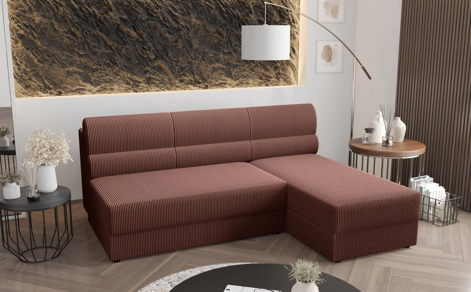 Trojrozměrné manšestrová tkanina s výrazným a silným žebrováním dodává zvláštní charakter a jedinečnou krásu. Tkanina je velmi měkká a přesto pevná a robustní. Čalounická tkanina Poso je odolnost proti oděru, a také snadno se udržuje v čistotě. Díky tomu bude skládací roh Fogu vypadat esteticky a elegantně po dlouhou dobu. Rohová sedací souprava s funkcí každodenního spaní je vyrobena z vysoce kvalitních materiálů, které jsou odolné vůči vnějším vlivům, jako je čalounění nábytku a různé druhy nárazů.