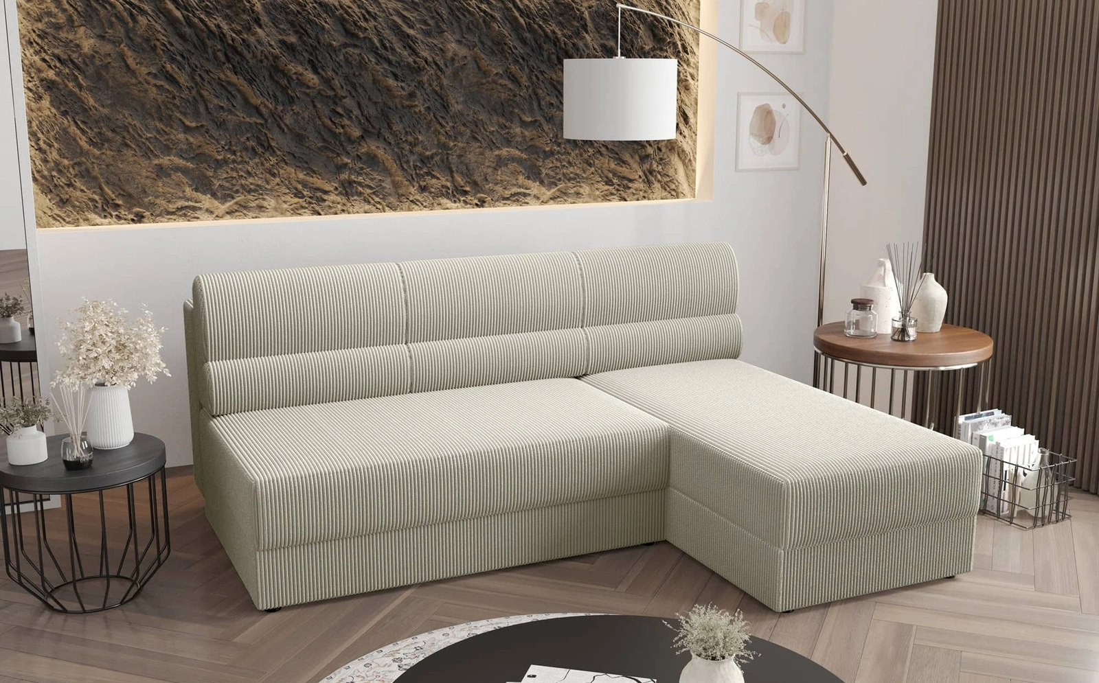 Rohová pohovka s funkcí spaní Fogu slonovinová kost pravostranná rohová pohovka s jednoduchým designem potažená nádobou na lůžkoviny z manšestrové látky