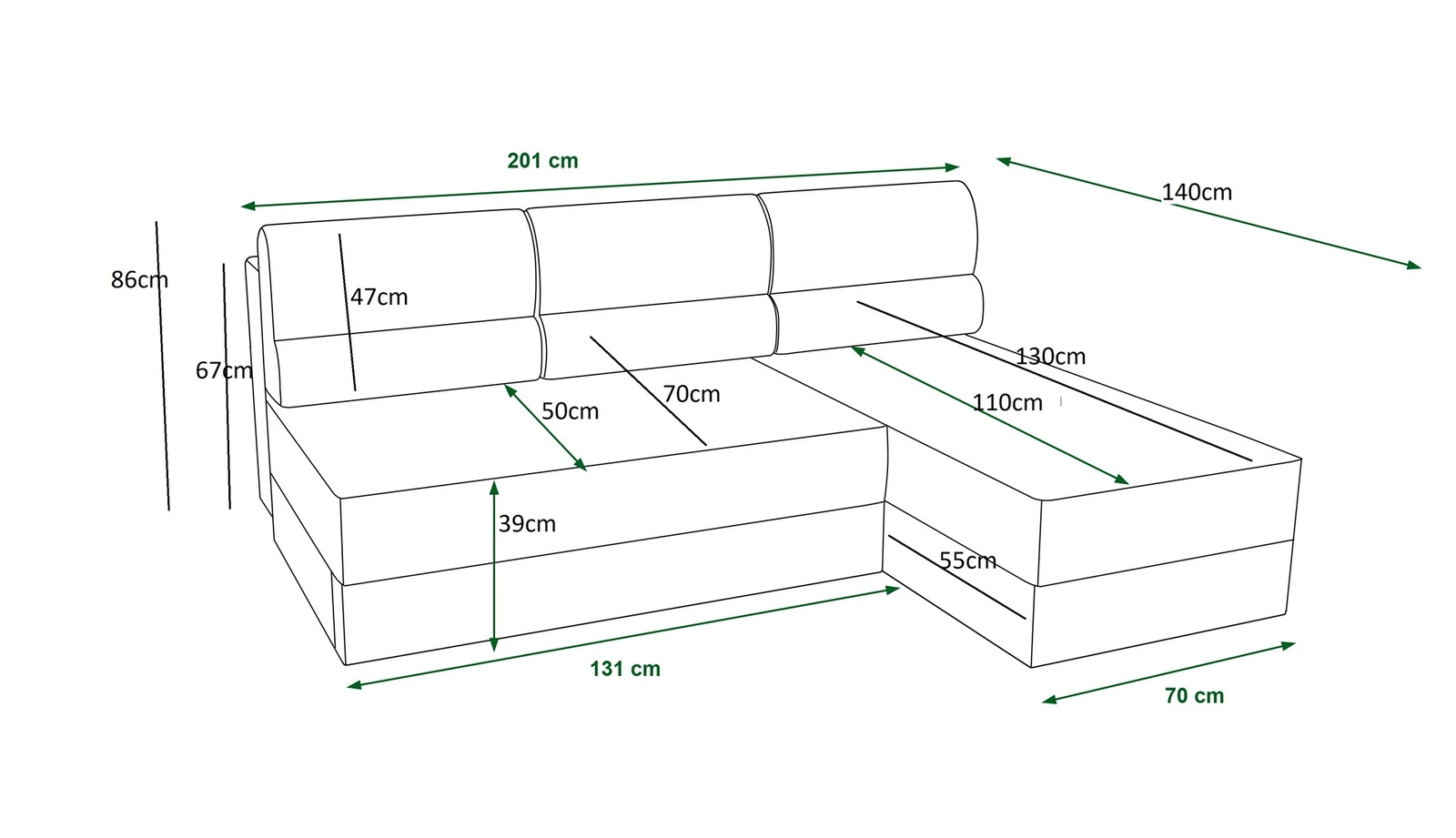 Díky svým rozměrům a široké funkčnosti je rohová pohovka s funkcí spaní ideální jako rohová pohovka do obývacího pokoje nebo jako rozkládací rohová pohovka do pokoje pro hosty. Rohová pohovka s funkcí spaní je také skvělou alternativou k posteli v pokoji pokoj pro mladé. Šířka rohu 201 cm, výška 86 cm a hloubka 140 cm. Spací plocha rohové jednotky je 130x200 cm. Výška sedadla nábytku je 39 cm, a výška opěradla je 47 cm. Polyuretanová pěna T30 je materiál, z něhož je vyrobeno sedadlo rohu. Soft opěrné polštáře zajistí vysokou úroveň pohodlí při každodenním odpočinku, což oceníte vy i vaši hosté, kteří se na tuto jedinečnou rohovou sedačku posadí.