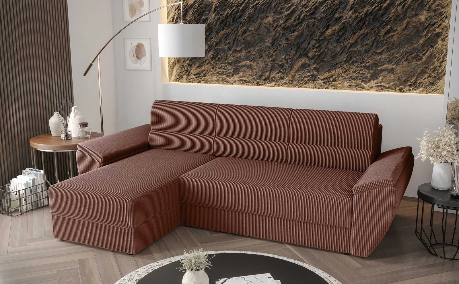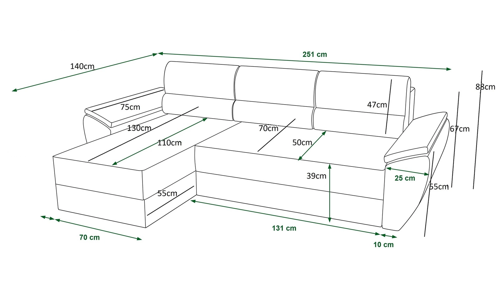 Díky svým rozměrům a široké funkčnosti je rohová pohovka s funkcí spaní ideální jako rohová pohovka do obývacího pokoje nebo jako rozkládací rohová pohovka do pokoje pro hosty. Rohová pohovka s funkcí spaní je také skvělou alternativou k posteli v pokoji pokoj pro mladé. Šířka rohu 251 cm, výška 88 cm a hloubka 140 cm. Spací plocha rohové jednotky je 130x200 cm. Výška sedadla nábytku je 39 cm, a výška opěradla je 47 cm. Polyuretanová pěna T30 je materiál, z něhož je vyrobeno sedadlo rohu. Soft opěrné polštáře zajistí vysokou úroveň pohodlí při každodenním odpočinku, což oceníte vy i vaši hosté, kteří se na tuto jedinečnou rohovou sedačku posadí.