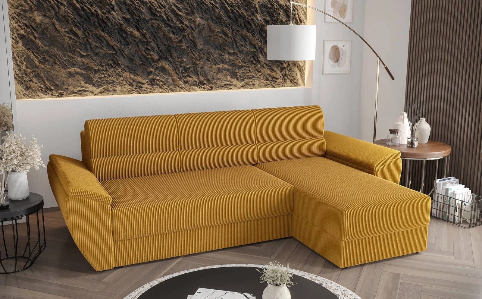 Trojrozměrné manšestrová tkanina s výrazným a silným žebrováním dodává zvláštní charakter a jedinečnou krásu. Tkanina je velmi měkká a přesto pevná a robustní. Čalounická tkanina Poso je odolnost proti oděru, a také snadno se udržuje v čistotě. Díky tomu bude skládací roh Fogu II vypadat esteticky a elegantně po dlouhou dobu. Rohová sedací souprava s funkcí každodenního spaní je vyrobena z vysoce kvalitních materiálů, které jsou odolné vůči vnějším vlivům, jako je čalounění nábytku a různé druhy nárazů.
