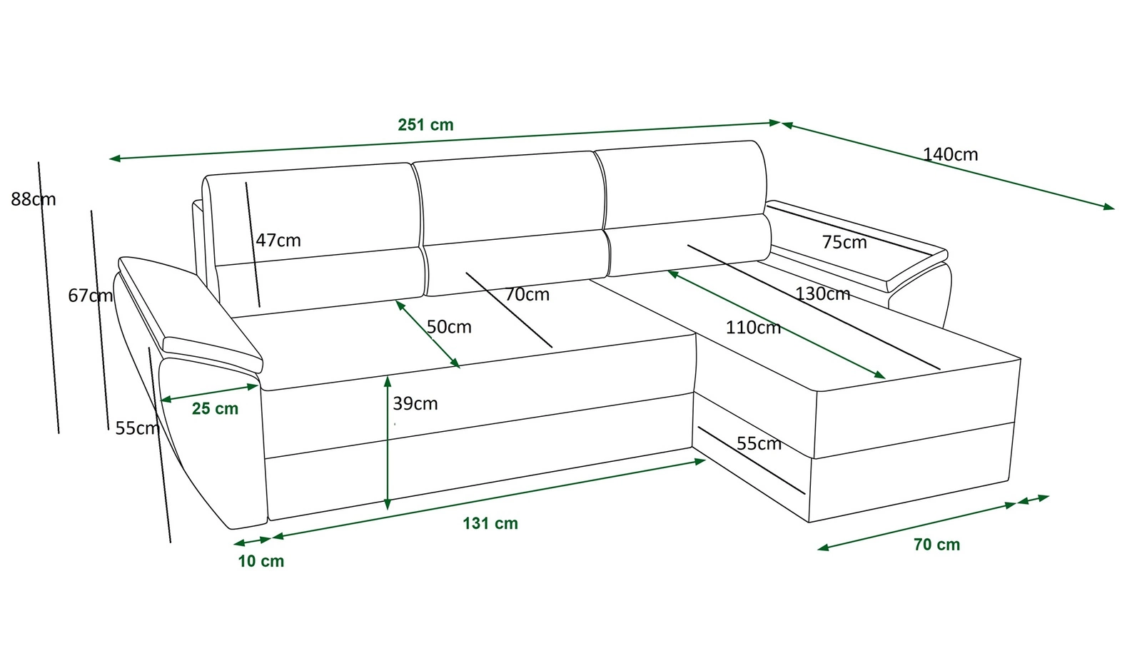 Díky svým rozměrům a široké funkčnosti je rohová pohovka s funkcí spaní ideální jako rohová pohovka do obývacího pokoje nebo jako rozkládací rohová pohovka do pokoje pro hosty. Rohová pohovka s funkcí spaní je také skvělou alternativou k posteli v pokoji pokoj pro mladé. Šířka rohu 251 cm, výška 88 cm a hloubka 140 cm. Spací plocha rohové jednotky je 130x200 cm. Výška sedadla nábytku je 39 cm, a výška opěradla je 47 cm. Polyuretanová pěna T30 je materiál, z něhož je vyrobeno sedadlo rohu. Soft opěrné polštáře zajistí vysokou úroveň pohodlí při každodenním odpočinku, což oceníte vy i vaši hosté, kteří se na tuto jedinečnou rohovou sedačku posadí.