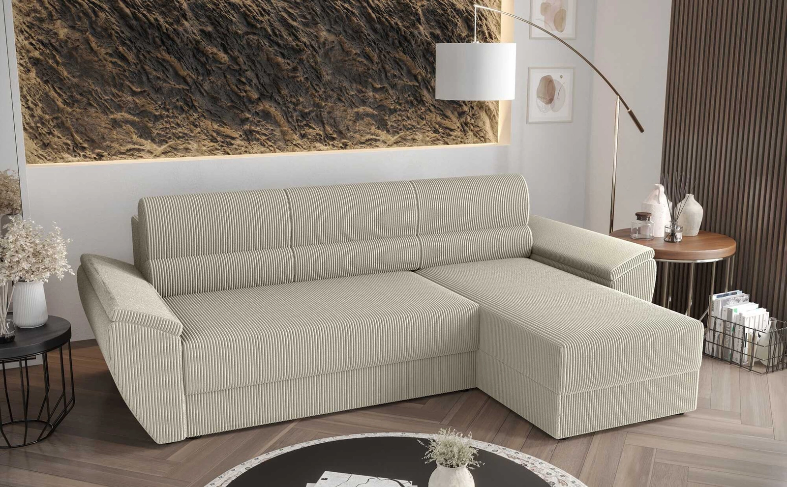 Trojrozměrné manšestrová tkanina s výrazným a silným žebrováním dodává zvláštní charakter a jedinečnou krásu. Tkanina je velmi měkká a přesto pevná a robustní. Čalounická tkanina Poso je odolnost proti oděru, a také snadno se udržuje v čistotě. Díky tomu bude skládací roh Fogu II vypadat esteticky a elegantně po dlouhou dobu. Rohová sedací souprava s funkcí každodenního spaní je vyrobena z vysoce kvalitních materiálů, které jsou odolné vůči vnějším vlivům, jako je čalounění nábytku a různé druhy nárazů.