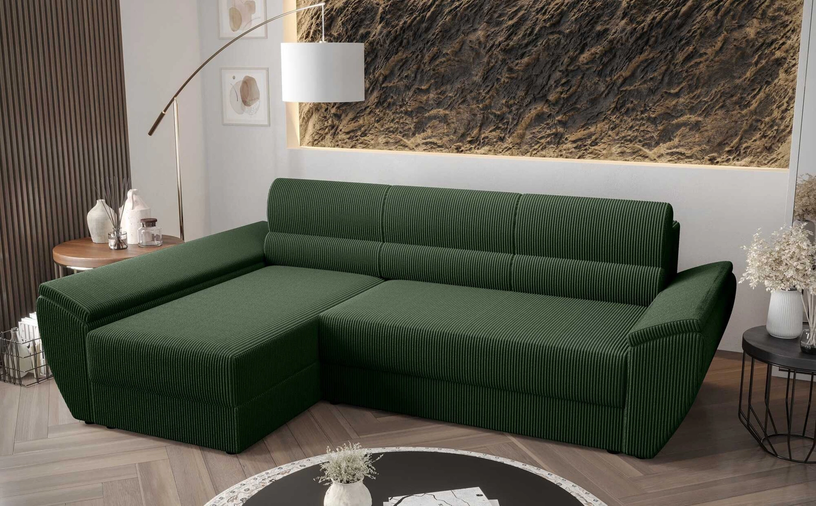 Rohová sedací souprava s funkcí spaní Fogu III zelená levá stylová rohová sedací souprava s područkami kontejner na lůžkoviny manšestrová látka