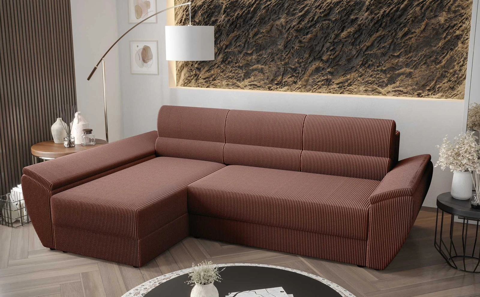 Trojrozměrné manšestrová tkanina s výrazným a silným žebrováním dodává zvláštní charakter a jedinečnou krásu. Tkanina je velmi měkká a přesto pevná a robustní. Čalounická tkanina Poso je odolnost proti oděru, a také snadno se udržuje v čistotě. Díky tomu bude polohovací roh Fogu III vypadat esteticky a elegantně po dlouhou dobu. Rohová sedací souprava s funkcí každodenního spaní je vyrobena z vysoce kvalitních materiálů, které jsou odolné vůči vnějším vlivům, jako je čalounění nábytku a různé druhy nárazů.