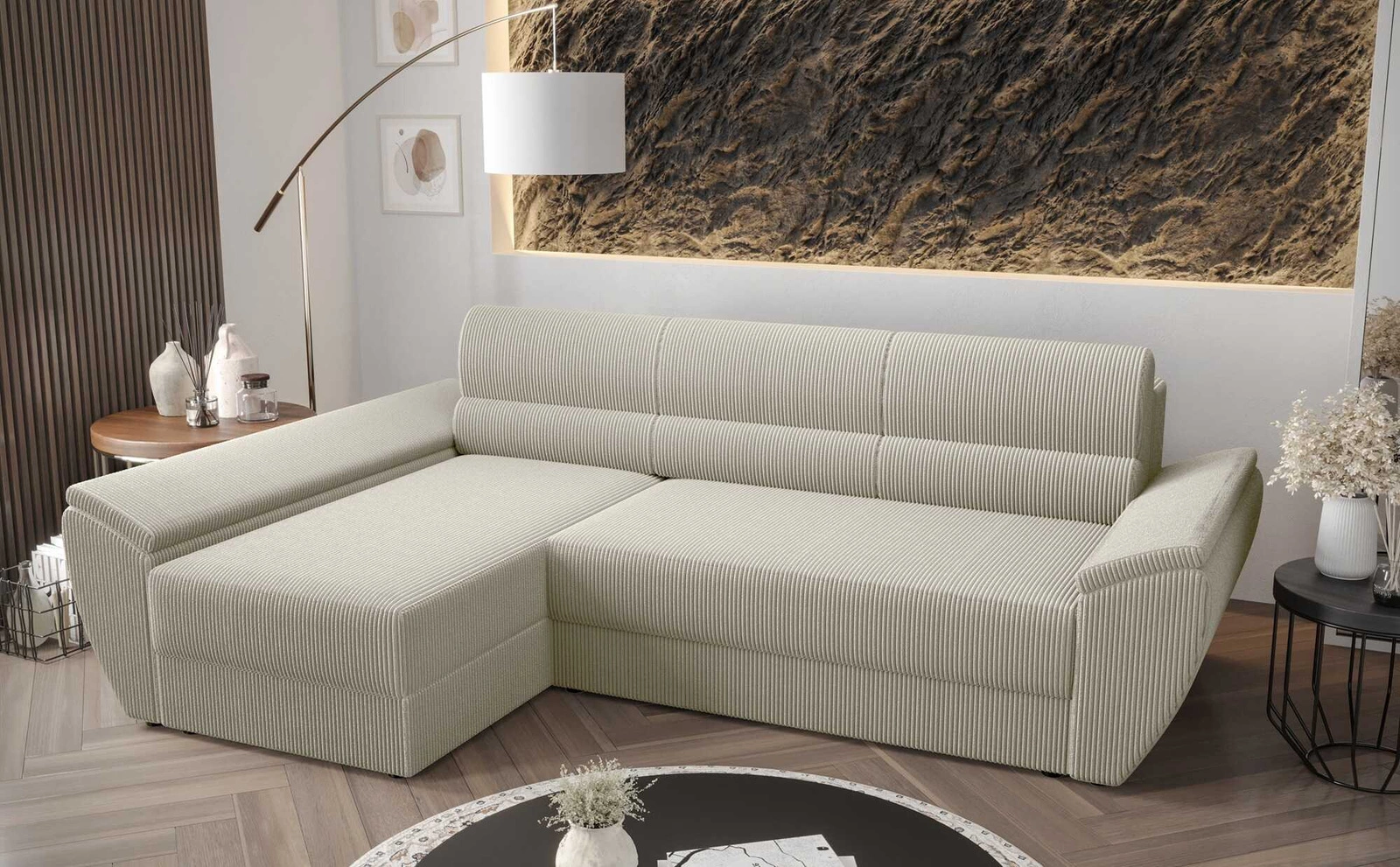 Trojrozměrné manšestrová tkanina s výrazným a silným žebrováním dodává zvláštní charakter a jedinečnou krásu. Tkanina je velmi měkká a přesto pevná a robustní. Čalounická tkanina Poso je odolnost proti oděru, a také snadno se udržuje v čistotě. Díky tomu bude polohovací roh Fogu III vypadat esteticky a elegantně po dlouhou dobu. Rohová sedací souprava s funkcí každodenního spaní je vyrobena z vysoce kvalitních materiálů, které jsou odolné vůči vnějším vlivům, jako je čalounění nábytku a různé druhy nárazů.