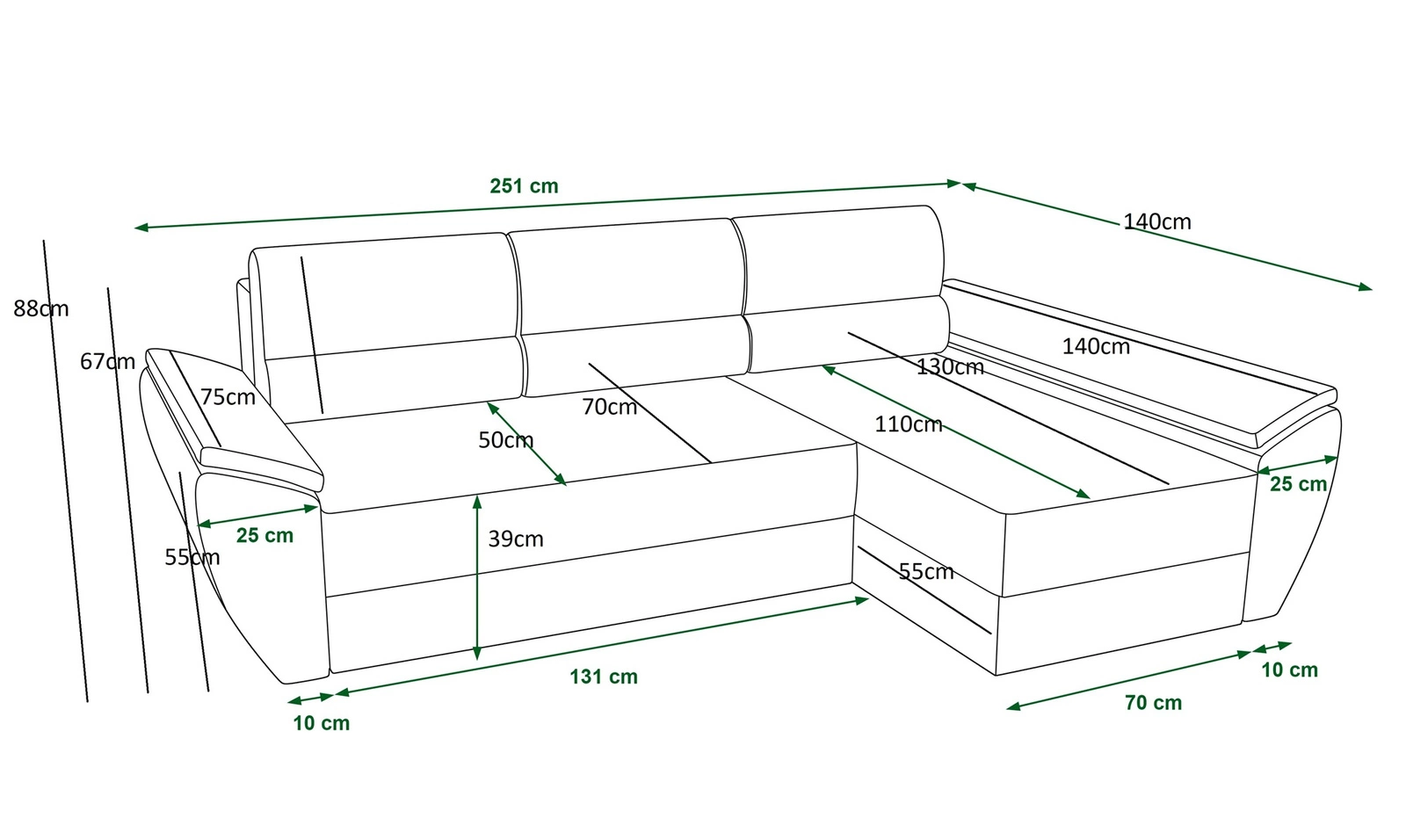 Díky svým rozměrům a široké funkčnosti je rohová pohovka s funkcí spaní ideální jako rohová pohovka do obývacího pokoje nebo jako rozkládací rohová pohovka do pokoje pro hosty. Rohová pohovka s funkcí spaní je také skvělou alternativou k posteli v pokoji pokoj pro mladé. Šířka rohu 251 cm, výška 88 cm a hloubka 140 cm. Spací plocha rohové jednotky je 130x200 cm. Výška sedadla nábytku je 39 cm, a výška opěradla je 47 cm. Polyuretanová pěna T30 je materiál, z něhož je vyrobeno sedadlo rohu. Soft opěrné polštáře zajistí vysokou úroveň pohodlí při každodenním odpočinku, což oceníte vy i vaši hosté, kteří se na tuto jedinečnou rohovou sedačku posadí.