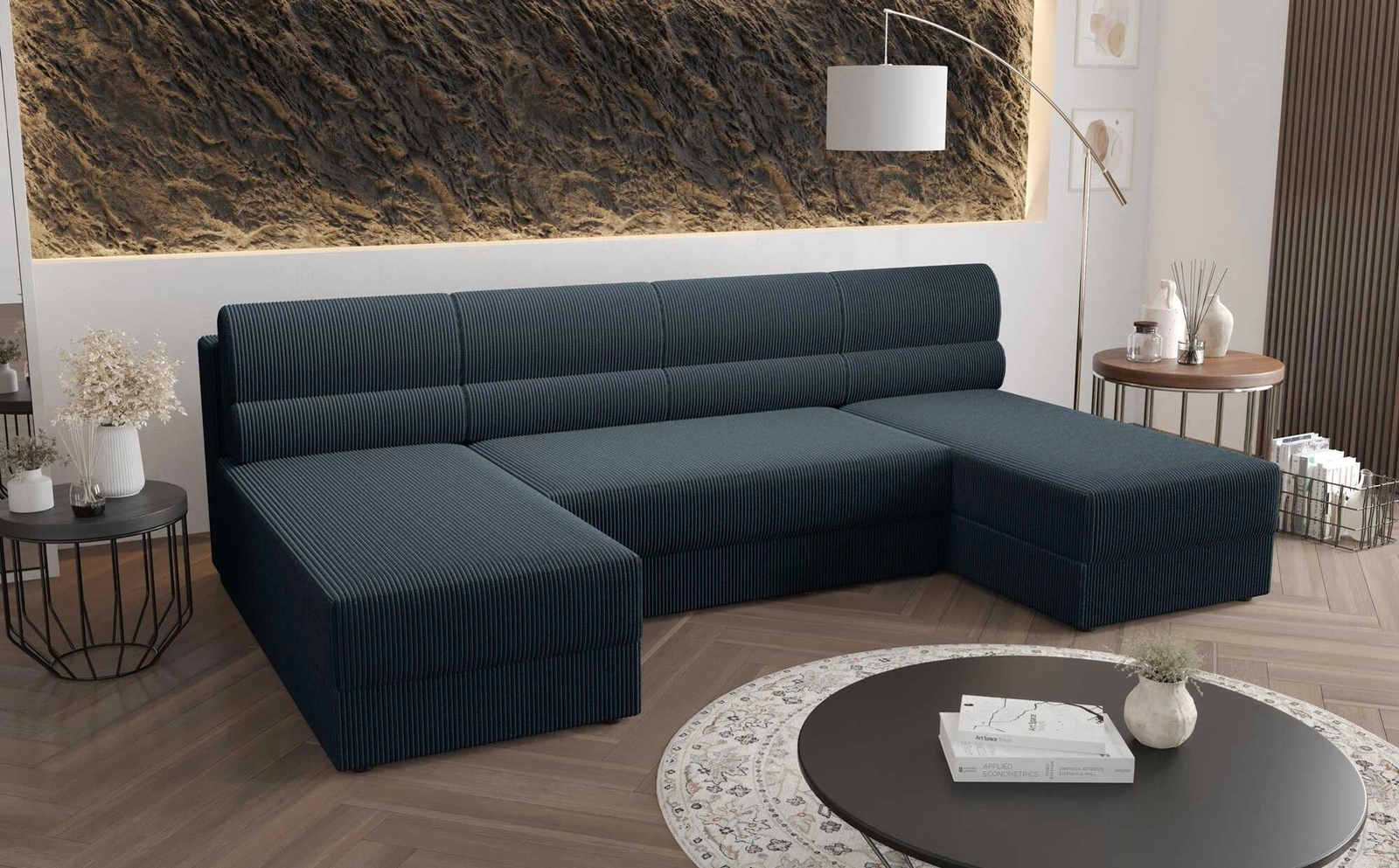 Rohová sedací souprava s funkcí spaní Fogu U modrá pohodlná a stylová rohová sedací souprava s jednoduchým designem kontejner na lůžkoviny z manšestrové látky