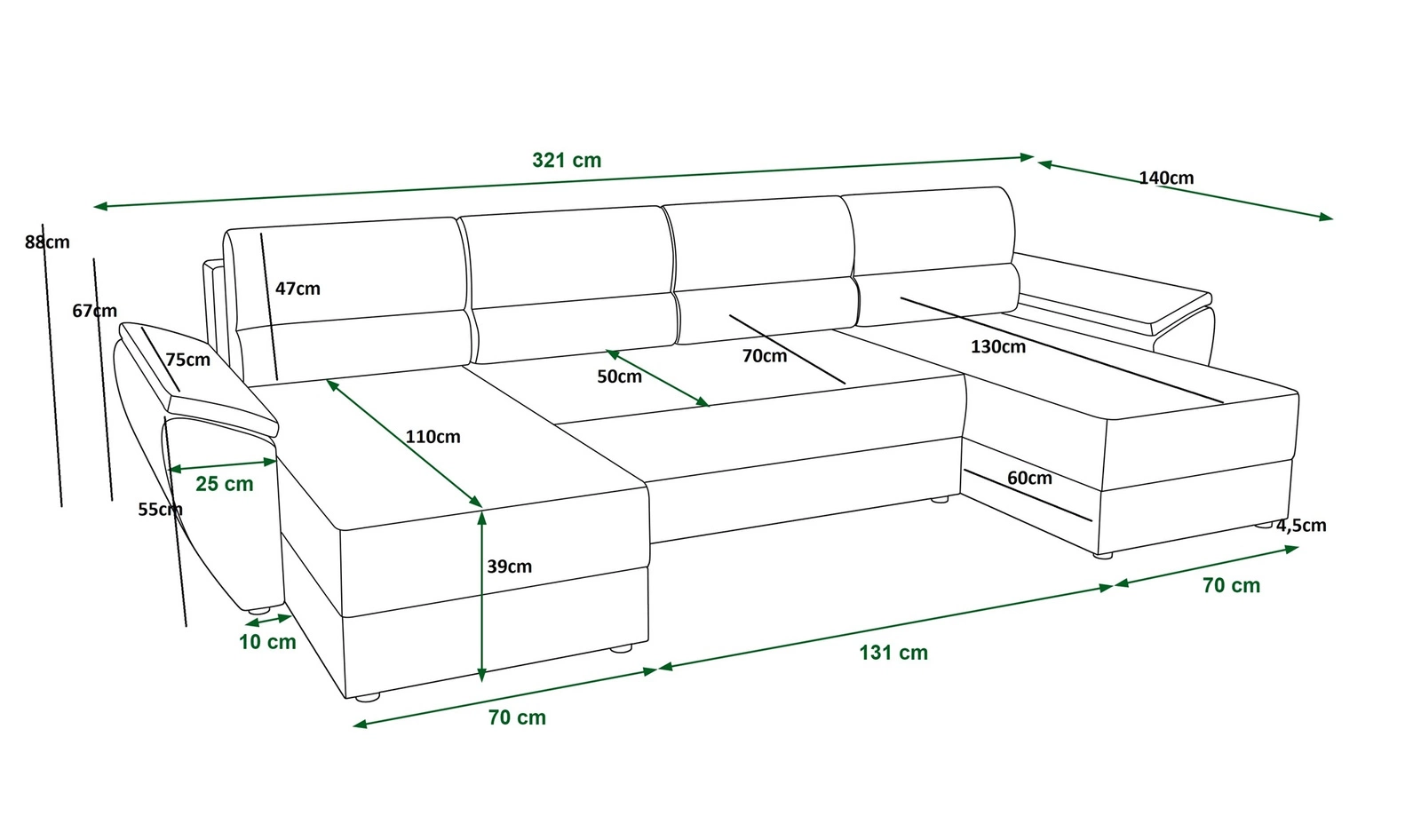 Díky svým rozměrům a široké funkčnosti je rohová pohovka s funkcí spaní ideální jako rohová pohovka do obývacího pokoje nebo jako rozkládací rohová pohovka do pokoje pro hosty. Rohová pohovka s funkcí spaní je také skvělou alternativou k posteli v pokoji pokoj pro mladé. Šířka rohu 321 cm, výška 88 cm a hloubka 140 cm. Spací plocha rohové jednotky je 130x270 cm. Výška sedadla nábytku je 39 cm, a výška opěradla je 47 cm. Polyuretanová pěna T30 je materiál, z něhož je vyrobeno sedadlo rohu. Soft opěrné polštáře zajistí vysokou úroveň pohodlí při každodenním odpočinku, což oceníte vy i vaši hosté, kteří se na tuto jedinečnou rohovou sedačku posadí.