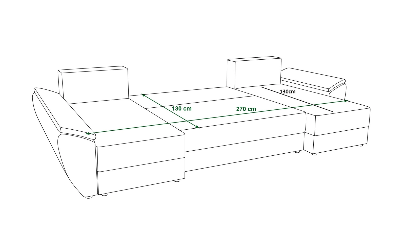Díky svým rozměrům a široké funkčnosti je rohová pohovka s funkcí spaní ideální jako rohová pohovka do obývacího pokoje nebo jako rozkládací rohová pohovka do pokoje pro hosty. Rohová pohovka s funkcí spaní je také skvělou alternativou k posteli v pokoji pokoj pro mladé. Šířka rohu 321 cm, výška 88 cm a hloubka 140 cm. Spací plocha rohové jednotky je 130x270 cm. Výška sedadla nábytku je 39 cm, a výška opěradla je 48 cm. Polyuretanová pěna T30 je materiál, z něhož je vyrobeno sedadlo rohu. Soft opěrné polštáře zajistí vysokou úroveň pohodlí při každodenním odpočinku, což oceníte vy i vaši hosté, kteří se na tuto jedinečnou rohovou sedačku posadí.