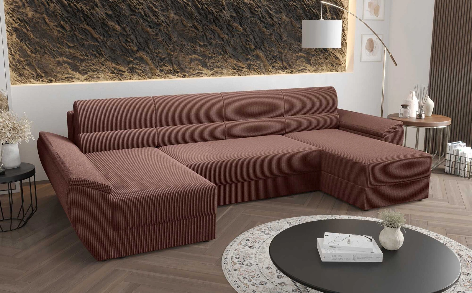 Trojrozměrné manšestrová tkanina s výrazným a silným žebrováním dodává zvláštní charakter a jedinečnou krásu. Tkanina je velmi měkká a přesto pevná a robustní. Čalounická tkanina Poso je odolnost proti oděru, a také snadno se udržuje v čistotě. Díky tomu bude skládací roh Fogu U III vypadat esteticky a elegantně po dlouhou dobu. Rohová sedací souprava s funkcí každodenního spaní je vyrobena z vysoce kvalitních materiálů, které jsou odolné vůči vnějším vlivům, jako je čalounění nábytku a různé druhy nárazů.