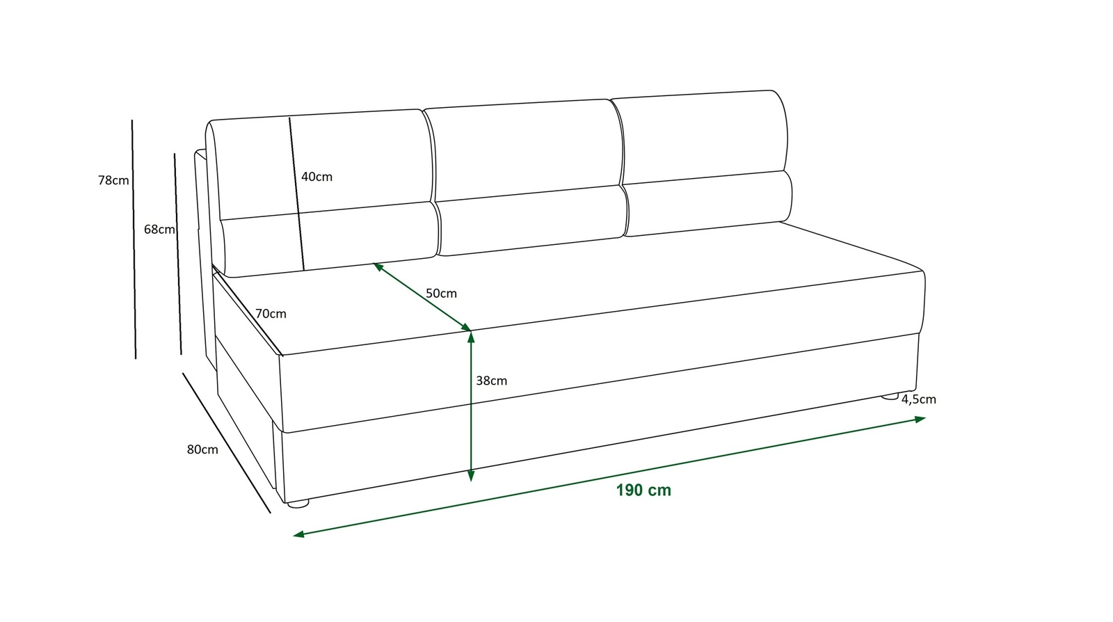 Rozložení celé spací plochy je velmi snadné a nevyžaduje velkou sílu. Sedadlo je rozkládací na dřevěných ližinách. Plocha pohovky na spaní je 130x190 cm. Nábytek je vybaven nízkými plastovými nožkami. Zaručuje pohodlné a bezproblémové používání a trvanlivost celého nábytku po mnoho let používání. Ideální jako pohovka do obývacího pokoje, pohovka s funkcí spaní a do jakéhokoli interiéru zařízeného ve vašem oblíbeném stylu.