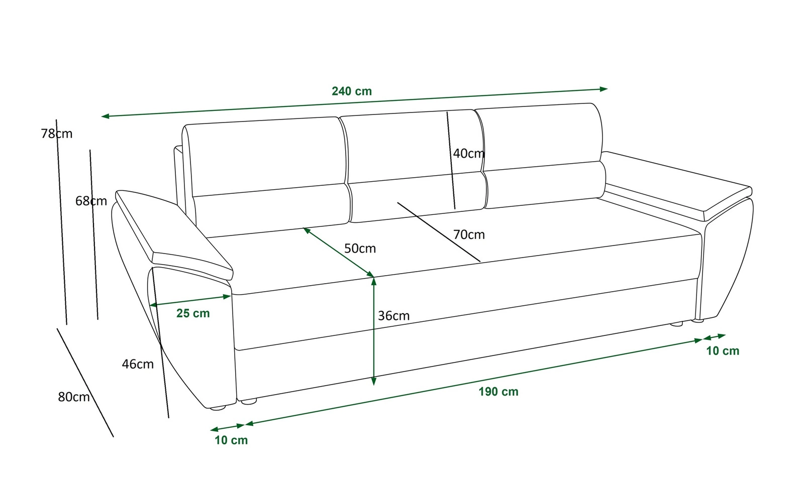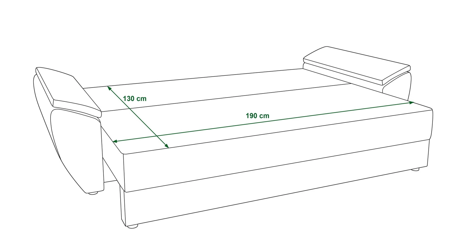 Rozložení celé spací plochy je velmi snadné a nevyžaduje velkou sílu. Sedadlo je rozkládací na dřevěných ližinách. Plocha pohovky na spaní je 130x190 cm. Nábytek je vybaven nízkými plastovými nožkami. Zaručuje pohodlné a bezproblémové používání a trvanlivost celého nábytku po mnoho let používání. Ideální jako pohovka do obývacího pokoje, pohovka s funkcí spaní a do jakéhokoli interiéru zařízeného ve vašem oblíbeném stylu.
