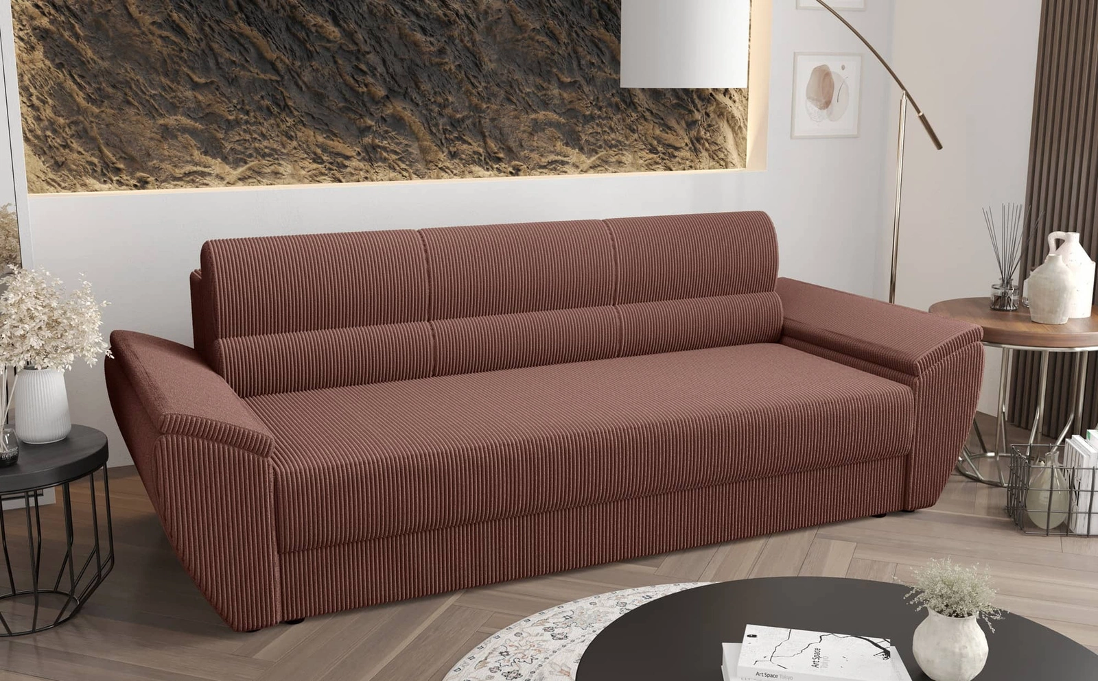 Pohovka s funkcí spaní Fogu Bis je mimořádně funkční kus nábytku navržený pro minimalistické uspořádání v moderním designu. Rozkládací pohovky z kolekce Fogu Bis jsou díky svým malým rozměrům ideální do menších bytů, kde je hlavní prioritou úspora místa a zároveň vytvoření pohodlného místa k odpočinku. Gauč má také čalouněná záda, takže jednotku lze umístit kamkoli, dokonce i doprostřed místnosti. Pohovka je celá potažená látkou z materiálu velur Poso 29. Vkusné opěrné polštáře se zajímavým tvarem a širokými područkami zajistí ještě větší komfort a pohodlí této vysoce moderní obývací sedačky.