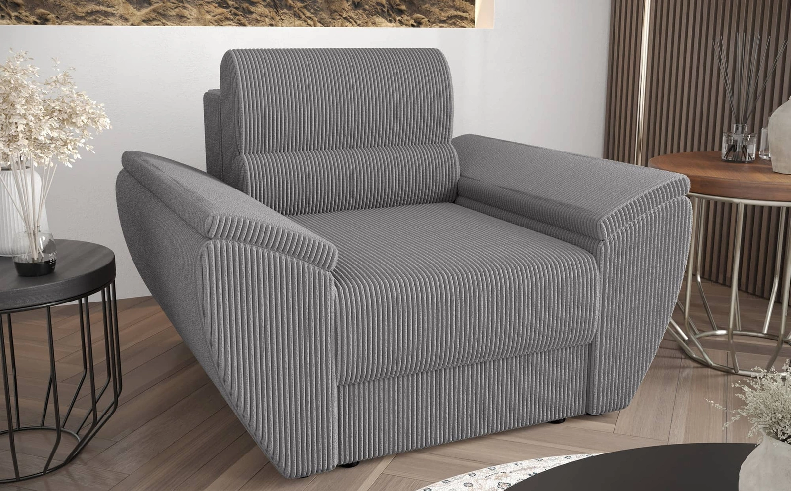 • Křeslo Fogu je moderní a pohodlný kus nábytku v minimalistickém provedení. Vyrobeno z měkké manšestrové tkaniny s výraznými pruhy pro jedinečný vzhled. Velurová křesla dokonale zapadnou do každého modernistického interiéru.