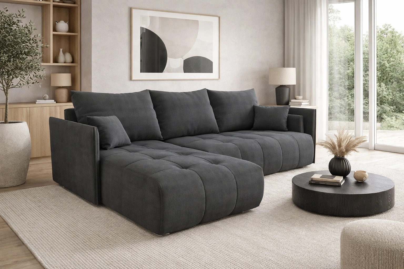 Rohová pohovka Selva v tmavě šedé barvě je atraktivním kusem nábytku, který snadno najde uplatnění v každé místnosti vašeho domova.