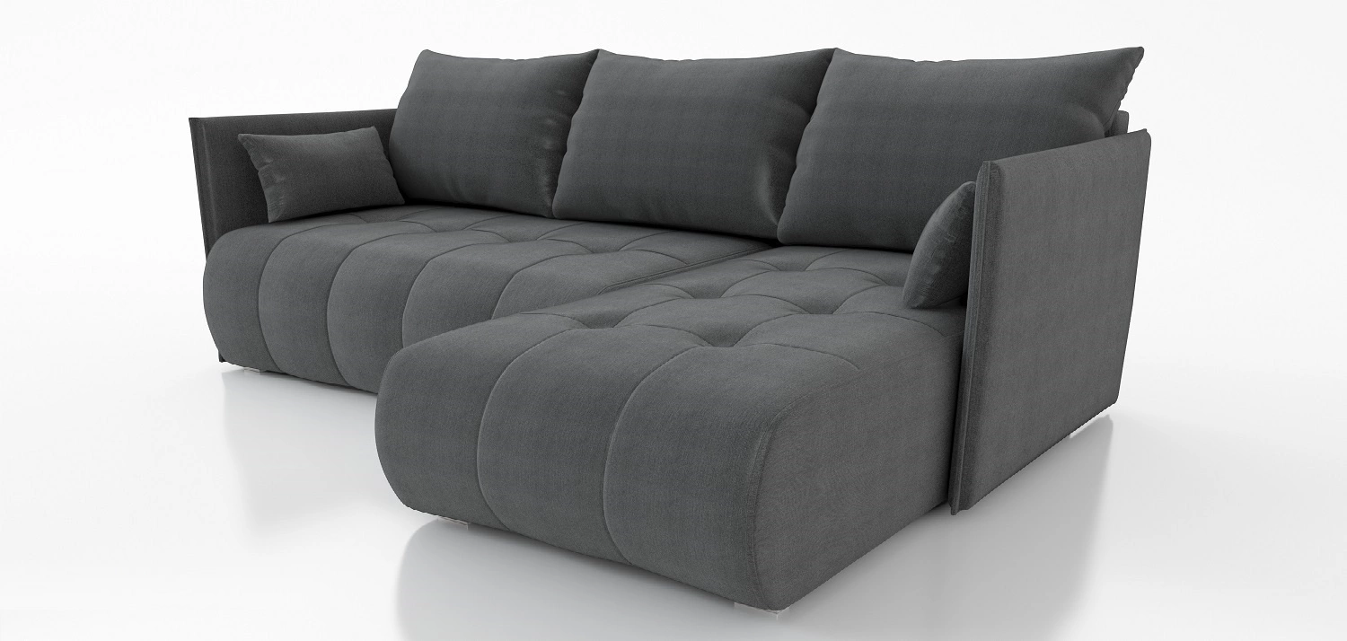 Díky svým rozměrům a široké funkčnosti je rohová pohovka s funkcí spaní ideální jako rohová pohovka do obývacího pokoje nebo jako rozkládací rohová pohovka do pokoje pro hosty. Rohová pohovka s funkcí spaní je také skvělou alternativou k posteli v pokoji pokoj pro mladé. Šířka rohu 218 cm, výška 88 cm a hloubka 152 cm. Spací plocha rohové jednotky je 140x206 cm. Výška sedadla nábytku je 40 cm, a výška opěradla je 48 cm. Vlnité pružiny a polyuretanová pěna T28 je materiál, z něhož je vyrobeno sedadlo rohu. Soft opěrné polštáře zajistí vysokou úroveň pohodlí při každodenním odpočinku, což oceníte vy i vaši hosté, kteří se na tuto jedinečnou rohovou sedačku posadí.