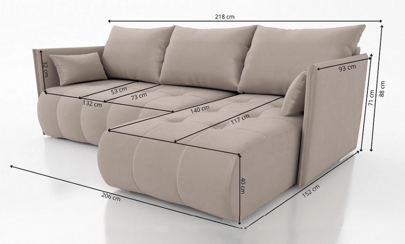 Díky svým rozměrům a široké funkčnosti je rohová pohovka s funkcí spaní ideální jako rohová pohovka do obývacího pokoje nebo jako rozkládací rohová pohovka do pokoje pro hosty. Rohová pohovka s funkcí spaní je také skvělou alternativou k posteli v pokoji pokoj pro mladé. Šířka rohu 218 cm, výška 88 cm a hloubka 152 cm. Spací plocha rohové jednotky je 140x206 cm. Výška sedadla nábytku je 40 cm, a výška opěradla je 48 cm. Vlnité pružiny a polyuretanová pěna T28 je materiál, z něhož je vyrobeno sedadlo rohu. Soft opěrné polštáře zajistí vysokou úroveň pohodlí při každodenním odpočinku, což oceníte vy i vaši hosté, kteří se na tuto jedinečnou rohovou sedačku posadí.
