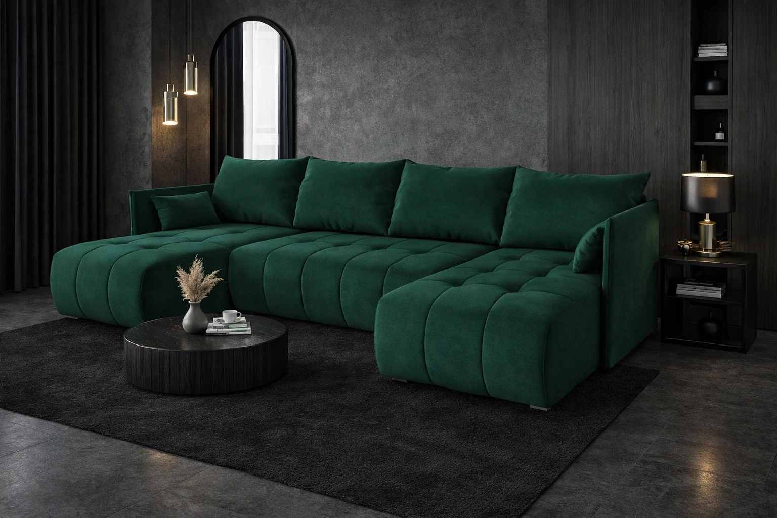Rohová jednotka Selva U v lahvově zelené barvě je atraktivní kus nábytku, který si snadno najde místo v každé místnosti vašeho domova.