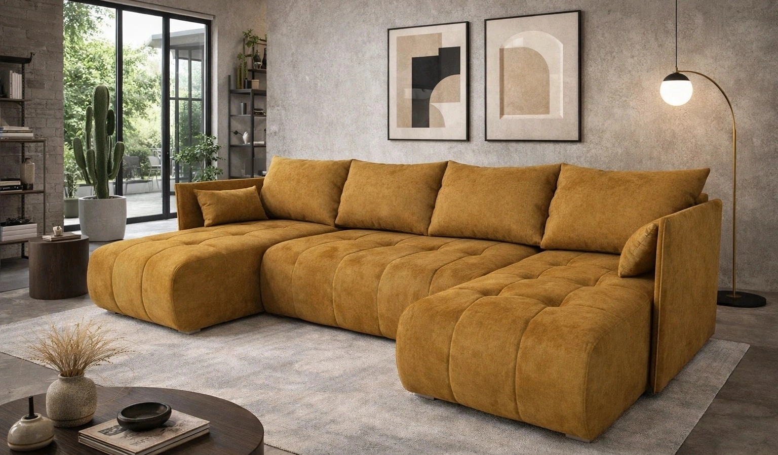 Rohová pohovka s funkcí spaní Selva U je jednoduchý kus nábytku s moderním designem, který dokonale zapadne do jakéhokoli interiéru. Pohovka je celá potažená látkou z materiálu sametem Terra 48. Rohová pohovka se vyznačuje tím, že vysokou kvalitou zpracování, moderní design zvýrazněný ozdobným prošíváním prošívání a quiltování zdobení sedadla hrudníku. Vkusné opěrné polštáře zajistí ještě větší komfort a pohodlí této vysoce moderní rohové jednotky.