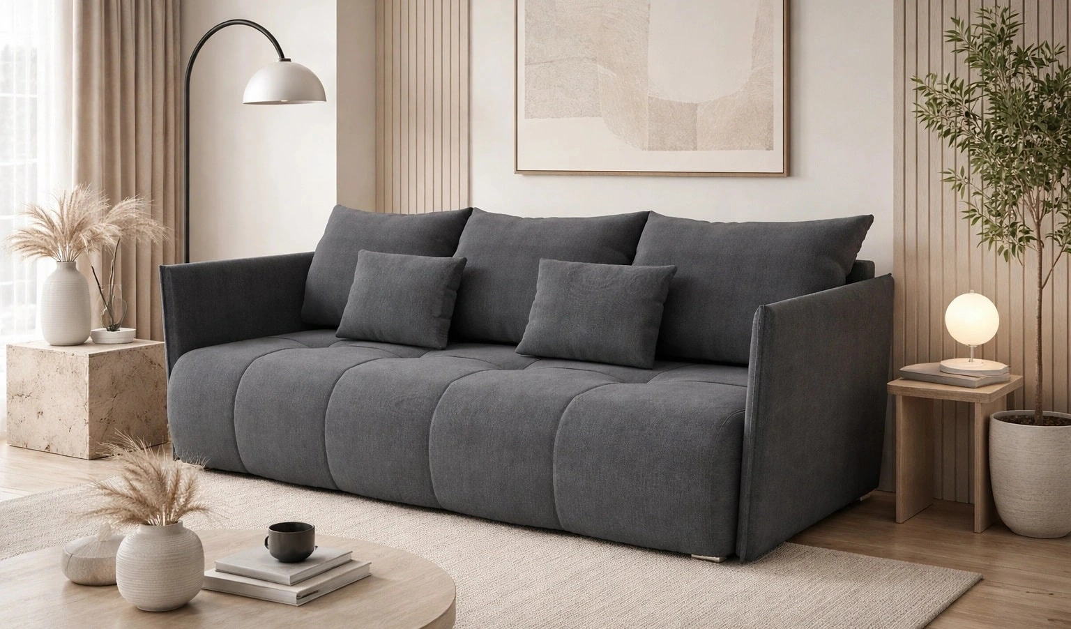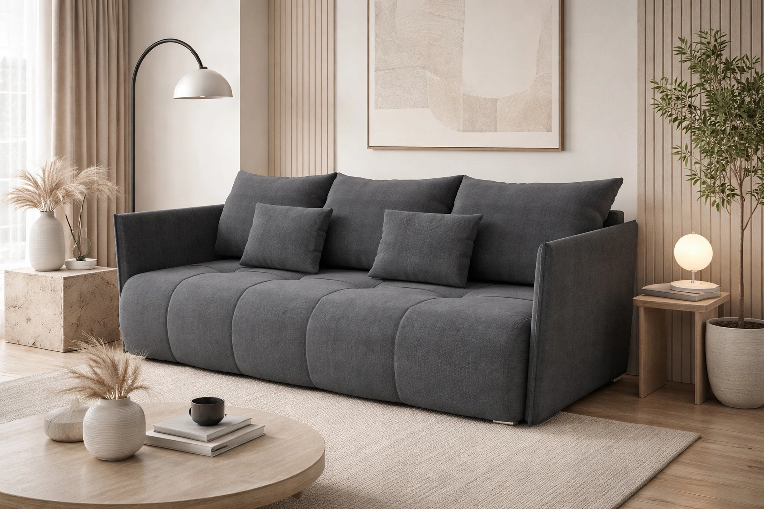 Rozkládací pohovka Selva v tmavě šedé barvě je atraktivním kusem nábytku, který snadno najde uplatnění v každé místnosti vašeho domova.