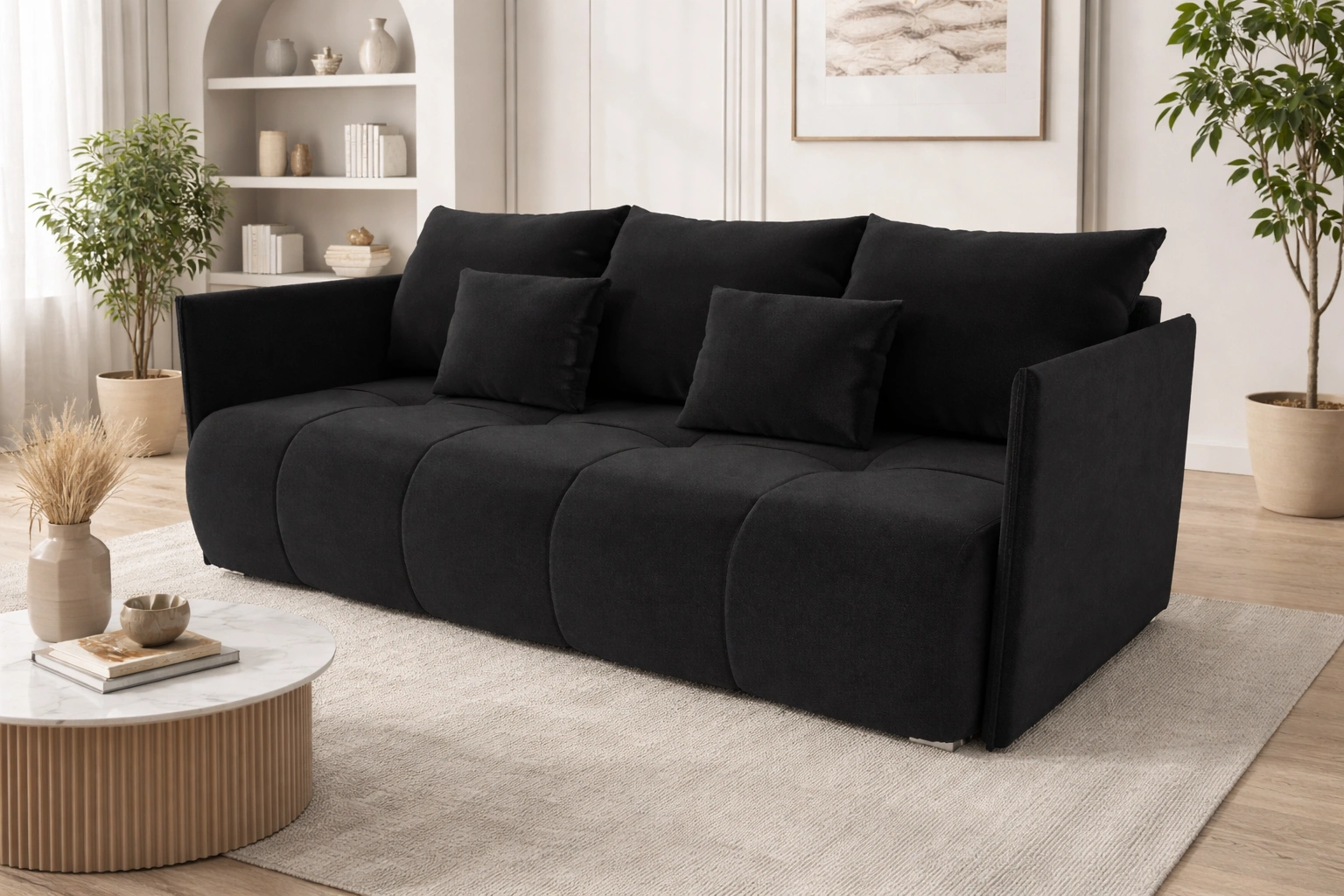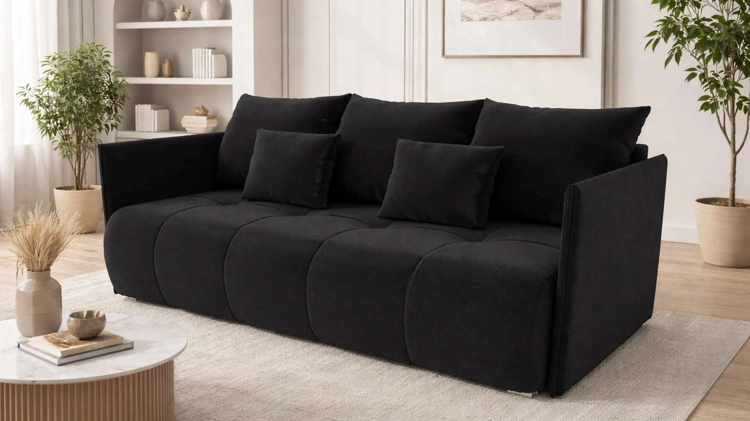 Rozkládací pohovka Selva v černé barvě je atraktivním kusem nábytku, který si snadno najde místo v každé místnosti vašeho domova.
