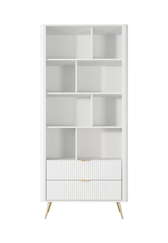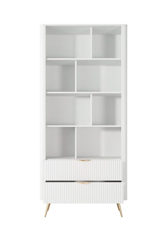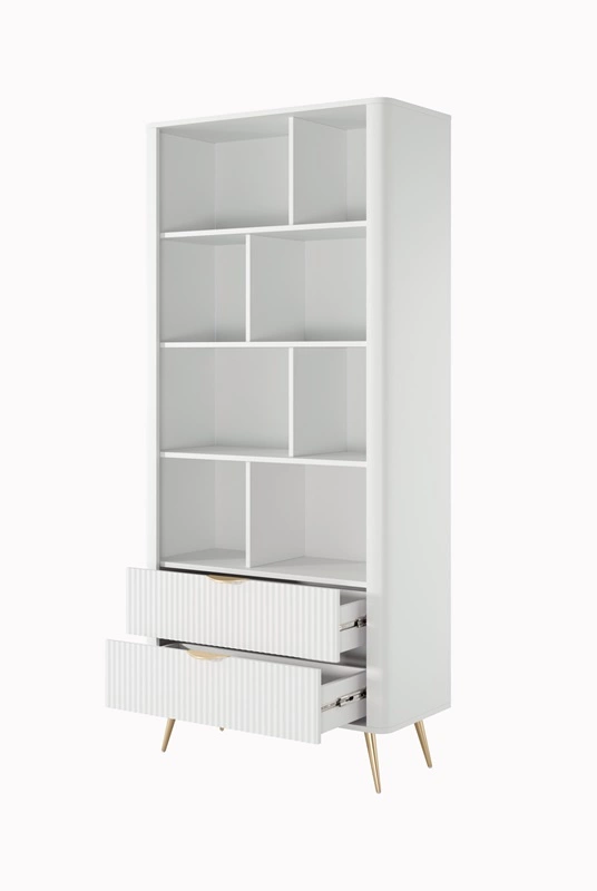Knihovna Lante 88 cm bílá elegantní knihovna se zásuvkami designové drážkování na čelech kovové hrany úchytky