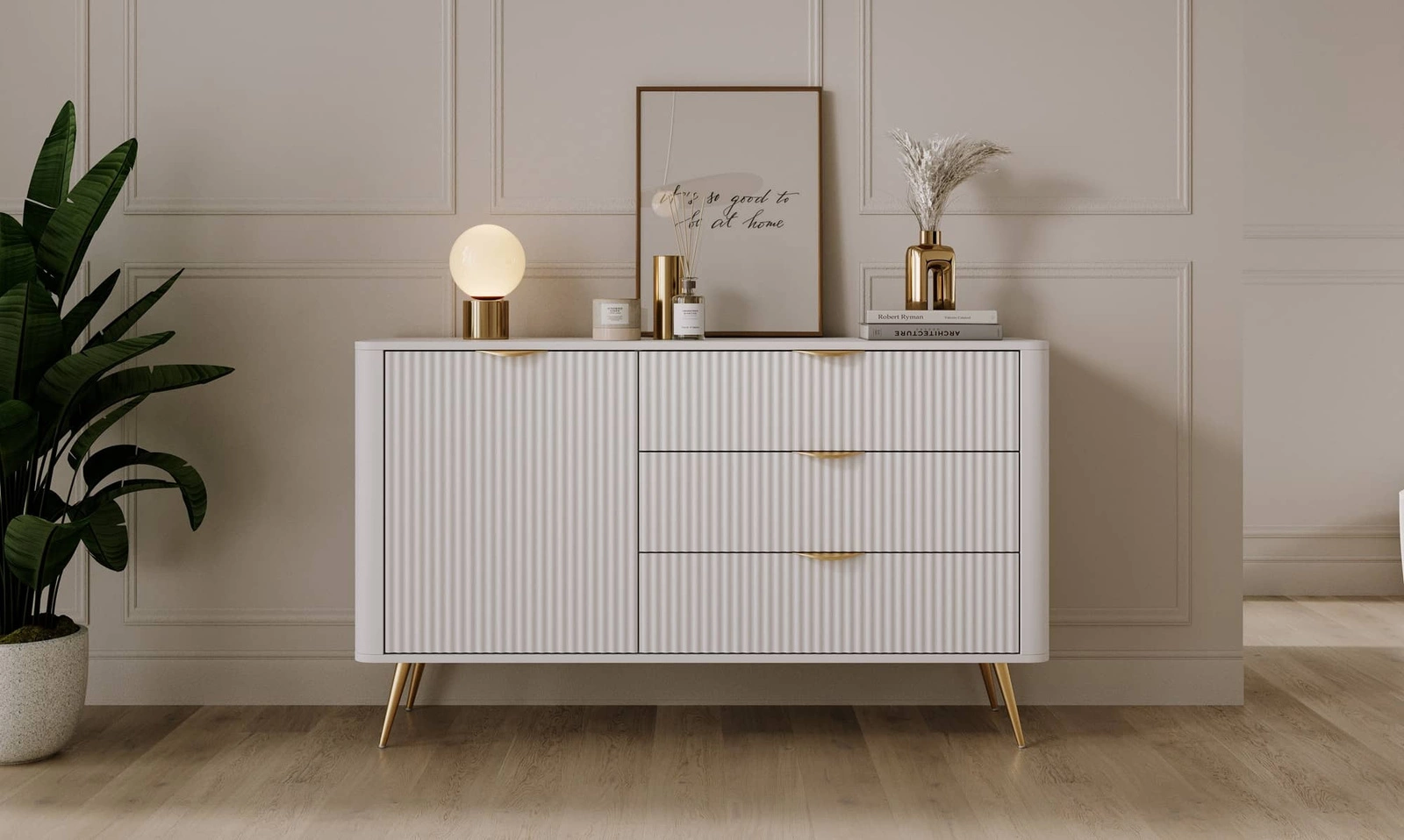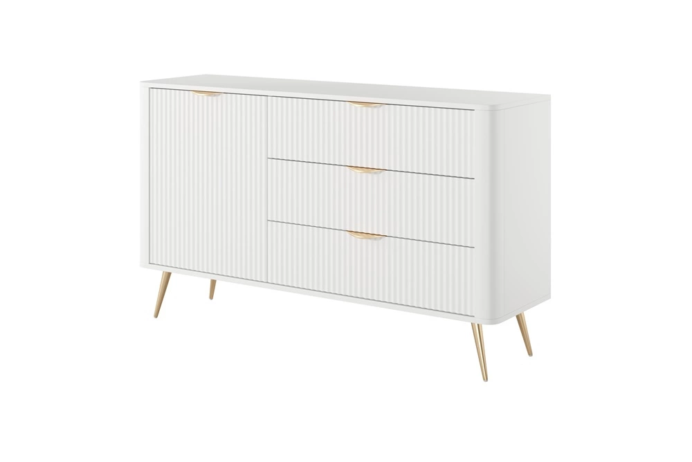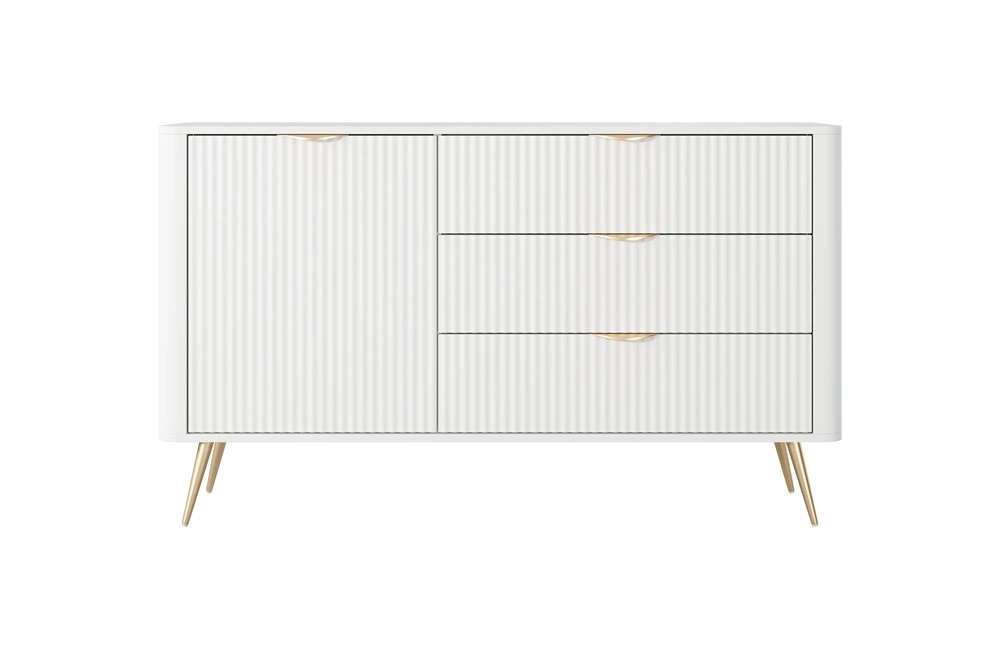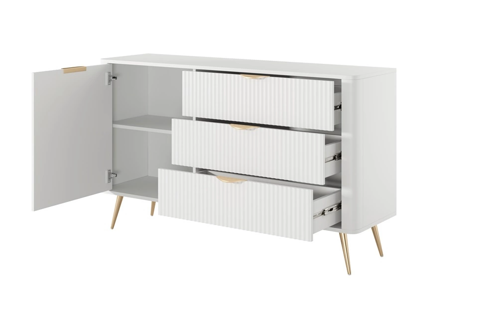 Drážkovaná čela byly vyrobeny z mDF. Tělo komody je vyrobeno z materiálu vysoce kvalitní laminovaná deska o tloušťce 16 mm, který je odolný vůči vnějším vlivům, jako jsou otlaky, nárazy a nešťastné škrábance. Konstrukce nábytku byla zdobena zlatem kovové nohy. Precizní zpracování a pozornost věnovaná detailům zajistí, že si komoda zachová svůj krásný vzhled po mnoho let, aniž by ztratila funkčnost.
