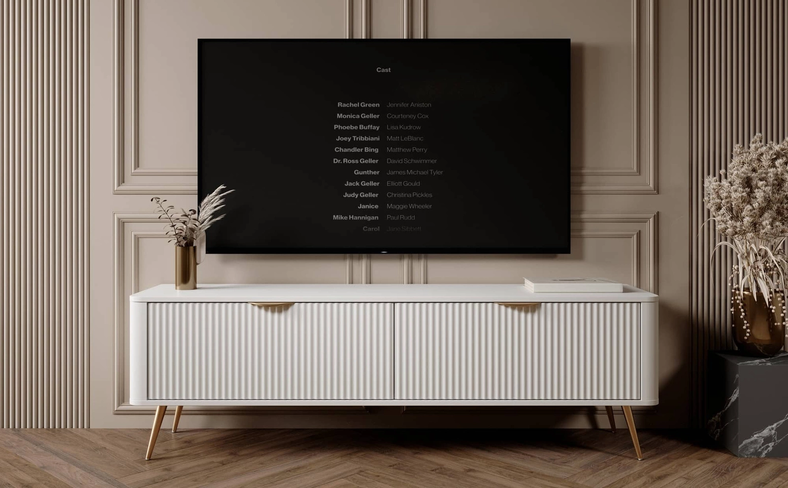 Drážkovaná čela byly vyrobeny z mDF. Tělo skříně RTV je vyrobeno z vysoce kvalitní laminovaná deska o tloušťce 16 mm, který je odolný vůči vnějším vlivům, jako jsou otlaky, nárazy a nešťastné škrábance. Konstrukce nábytku byla zdobena zlatem kovové nohy. Precizní zpracování a pozornost věnovaná detailům zajistí, že si televizní skříňka zachová svůj krásný vzhled po mnoho let, aniž by ztratila funkčnost.