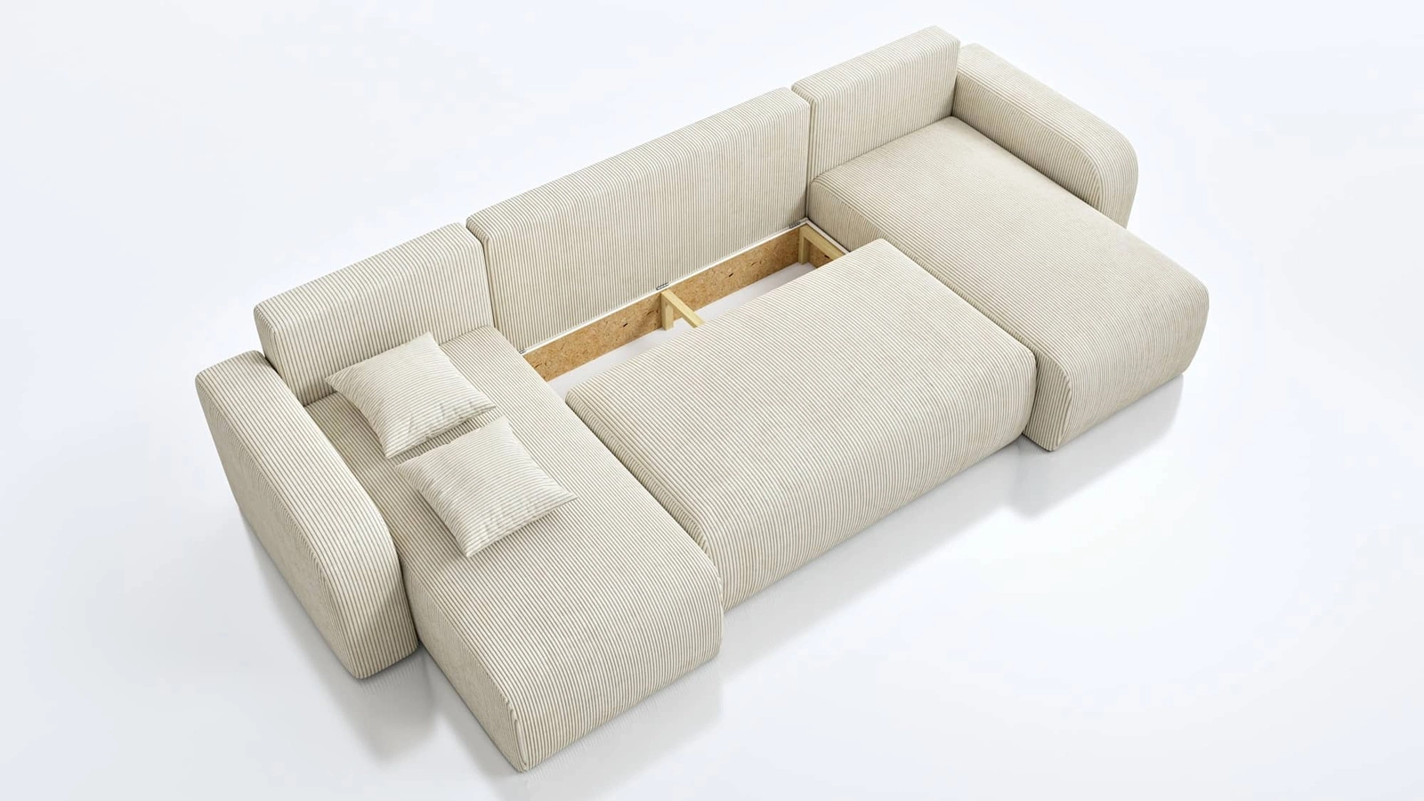 Rohová sedací souprava s funkcí spaní Fiesta U béžová Stylová rohová sedací souprava se zajímavým tvarem Odolná tkaná látka Nádoba na lůžkoviny