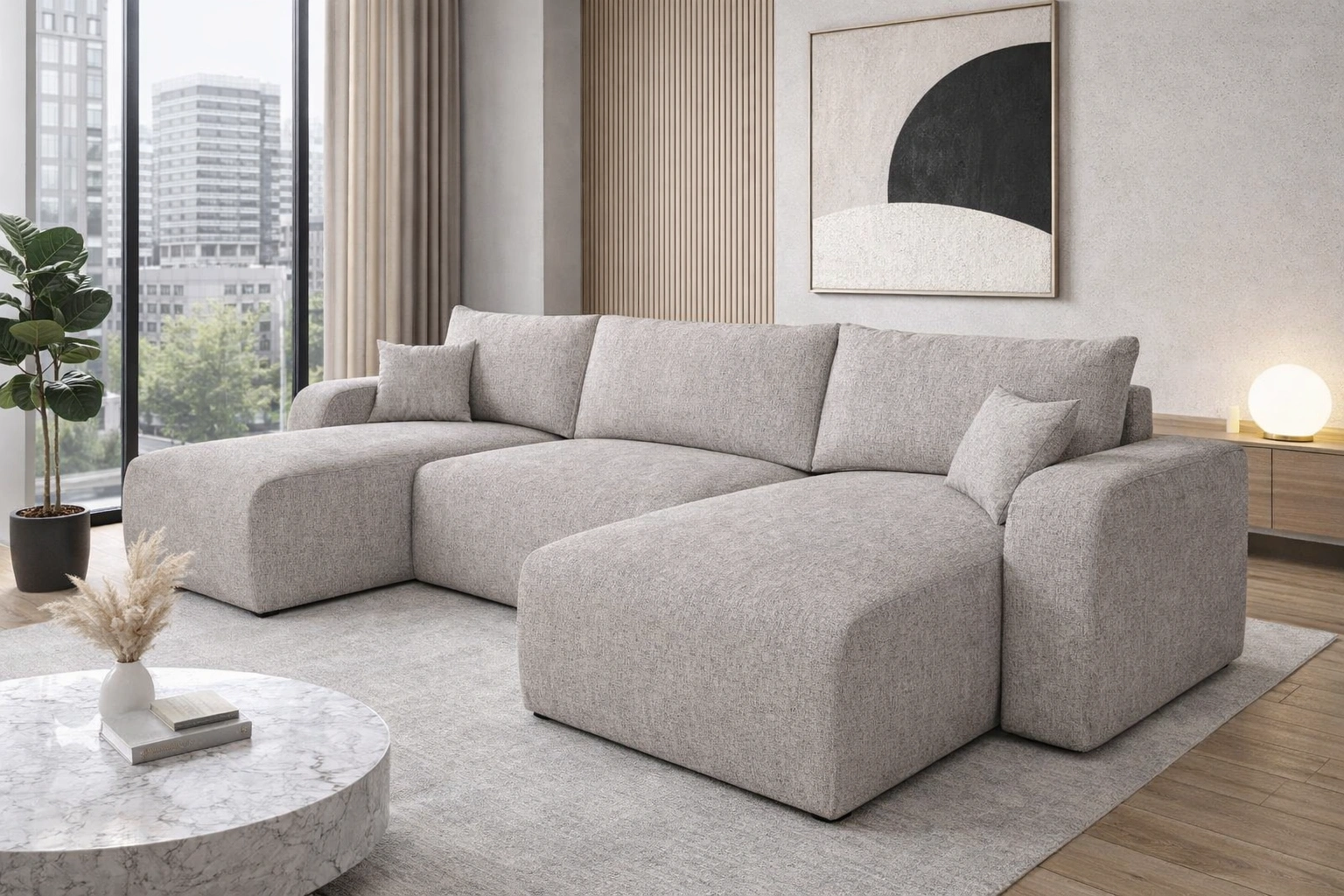 Tkanina Neve se vyznačuje vysokou odolností proti vyblednutí, což je ideální pro velmi slunné interiéry. Pevný a odolný, ale zároveň velmi příjemný na dotek, tkaný materiál je také.. se snadno udržuje v čistotě. Classic pletená textura v kombinaci s melanžovým efektem dodává nábytku jedinečnou hloubku a eleganci. Další výhodou tkaniny Neve je její vysoká odolnost proti oděru. Skládací roh Fiesta U tak bude dlouho vypadat esteticky a elegantně. Rohová sedací souprava s funkcí každodenního spaní je vyrobena z vysoce kvalitních materiálů, které jsou odolné vůči vnějším vlivům, jako je čalounění nábytku a různé druhy nárazů.