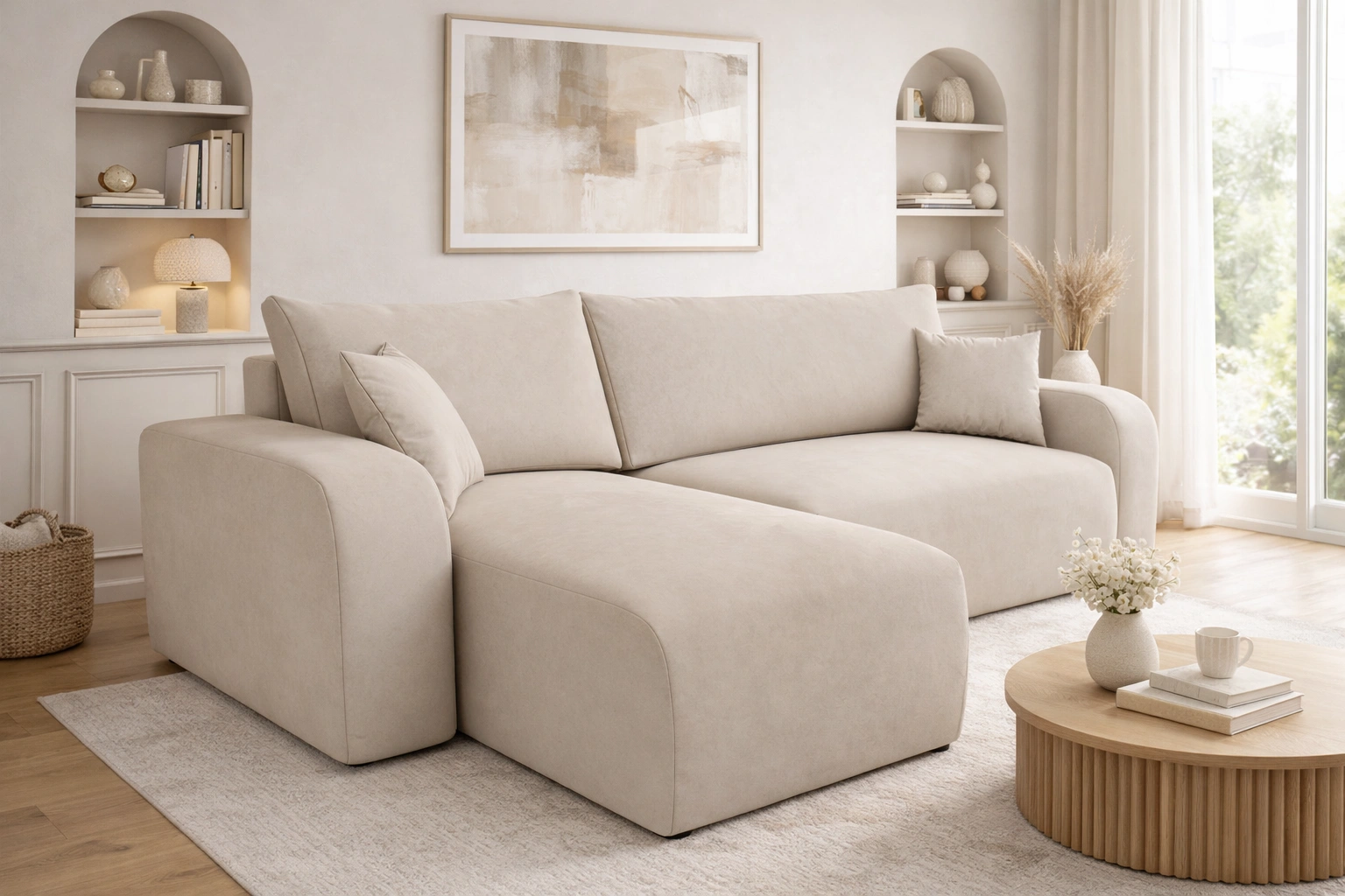 Rohová sedací souprava s funkcí spaní Fiesta světle béžová víceúčelová rohová sedací souprava z látky s plyšovým povrchem nádoby na lůžkoviny
