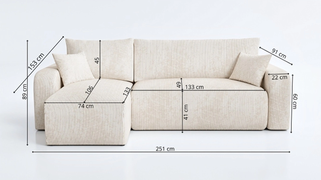 Díky svým rozměrům a široké funkčnosti je rohová pohovka s funkcí spaní ideální jako rohová pohovka do obývacího pokoje nebo jako rozkládací rohová pohovka do pokoje pro hosty. Rohová pohovka s funkcí spaní je také skvělou alternativou k posteli v pokoji pokoj pro mladé. Šířka rohu 251 cm, výška 89 cm a hloubka 153 cm. Spací plocha rohové jednotky je 133x207 cm. Výška sedadla nábytku je 41 cm, a výška opěradla je 45 cm. Vlnité pružiny a polyuretanová pěna T28 je materiál, z něhož je vyrobeno sedadlo rohu. Soft opěrné polštáře zajistí vysokou úroveň pohodlí při každodenním odpočinku, což oceníte vy i vaši hosté, kteří se na tuto jedinečnou rohovou sedačku posadí.