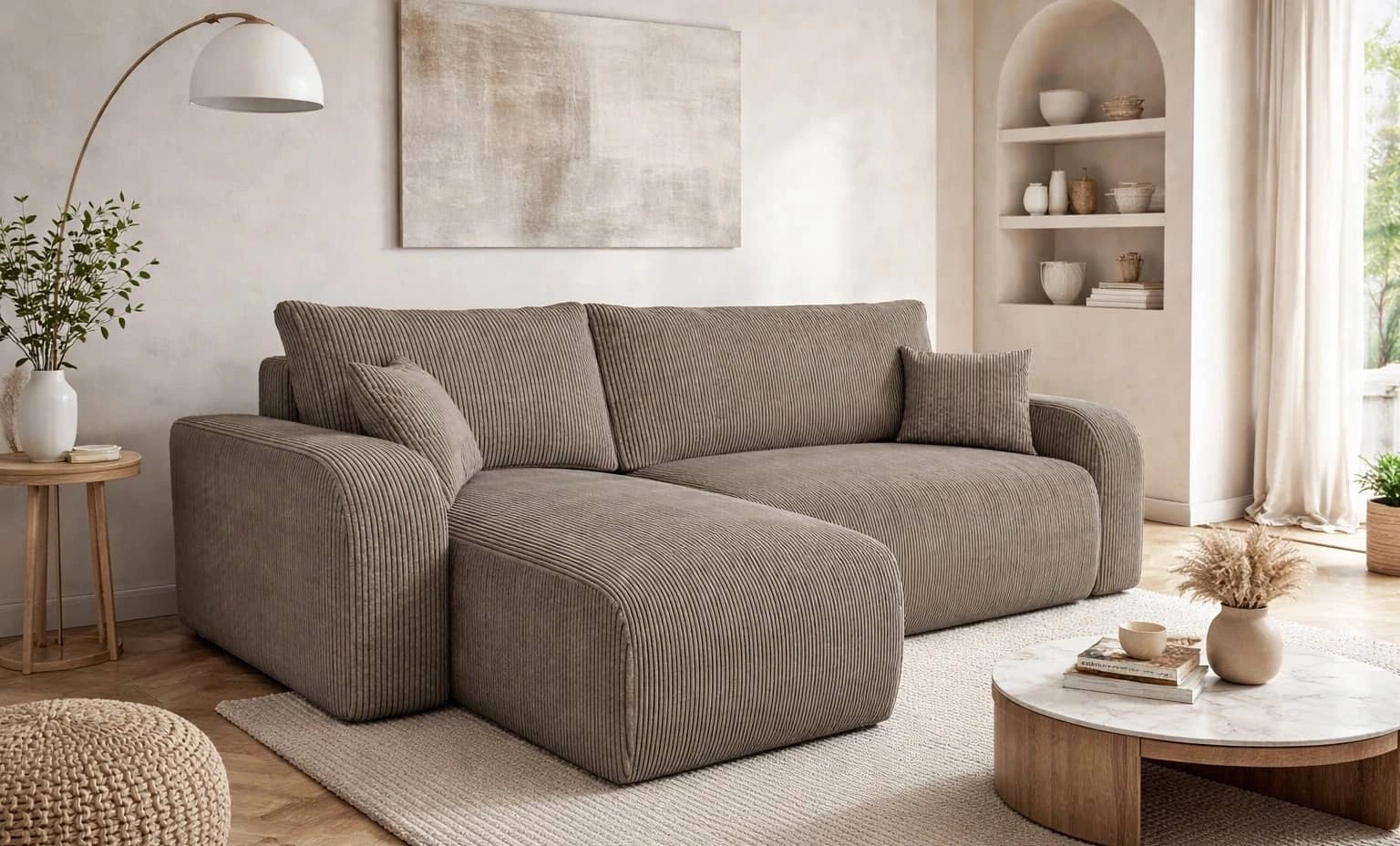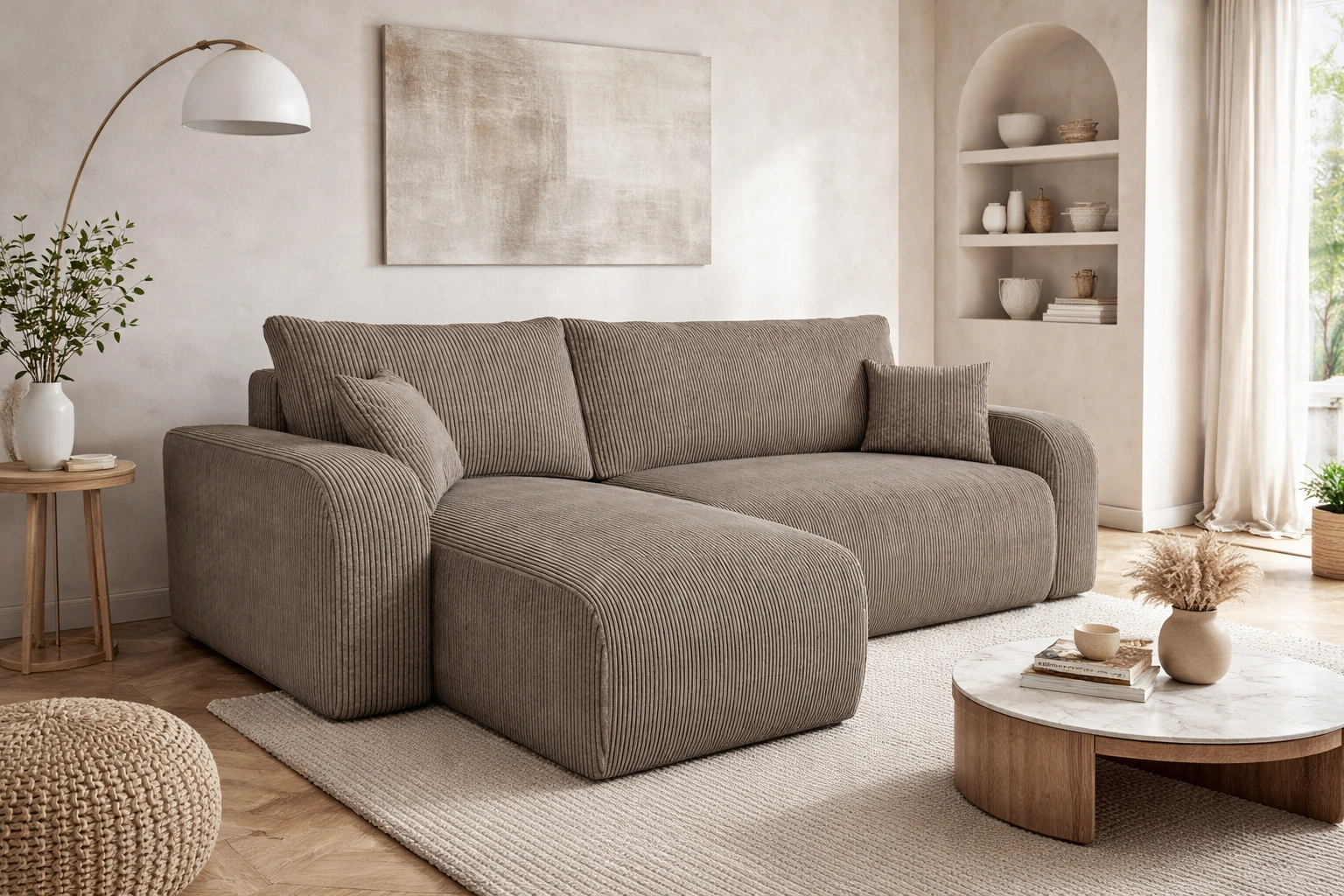 Rohová sedačka s funkcí spaní Fiesta světle hnědá univerzální rohová sedačka do obývacího pokoje kontejner na lůžkoviny z manšestrové látky