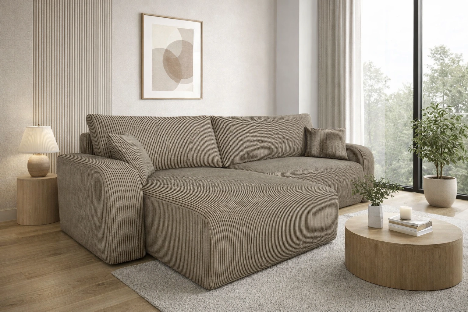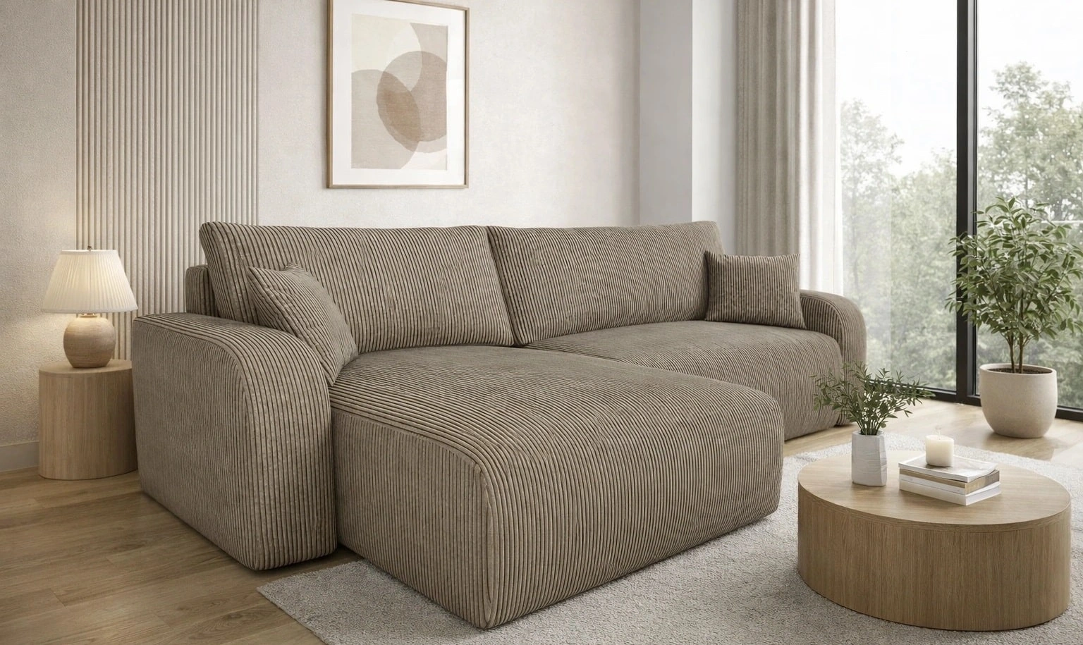 Rohová pohovka s funkcí spaní Fiesta XL světle hnědá univerzální rohová pohovka s úložným prostorem na lůžkoviny stylová manšestrová látka