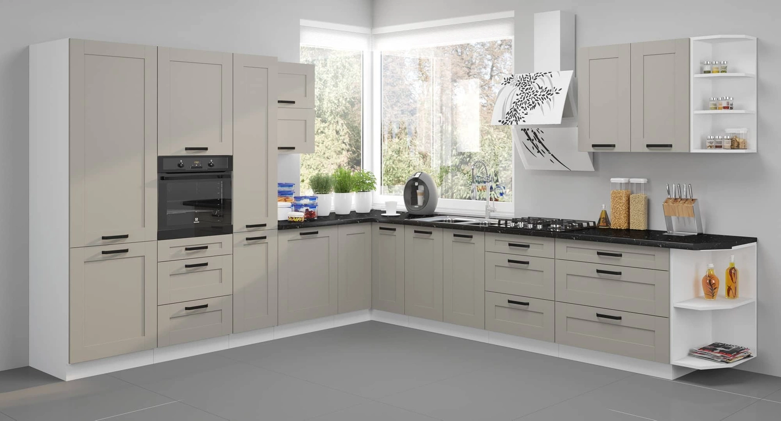 Stylovým doplňkem čel kuchyňských skříněk je černá rukojeť, které kromě své hlavní funkce dodávají nábytku zvláštní charakter.