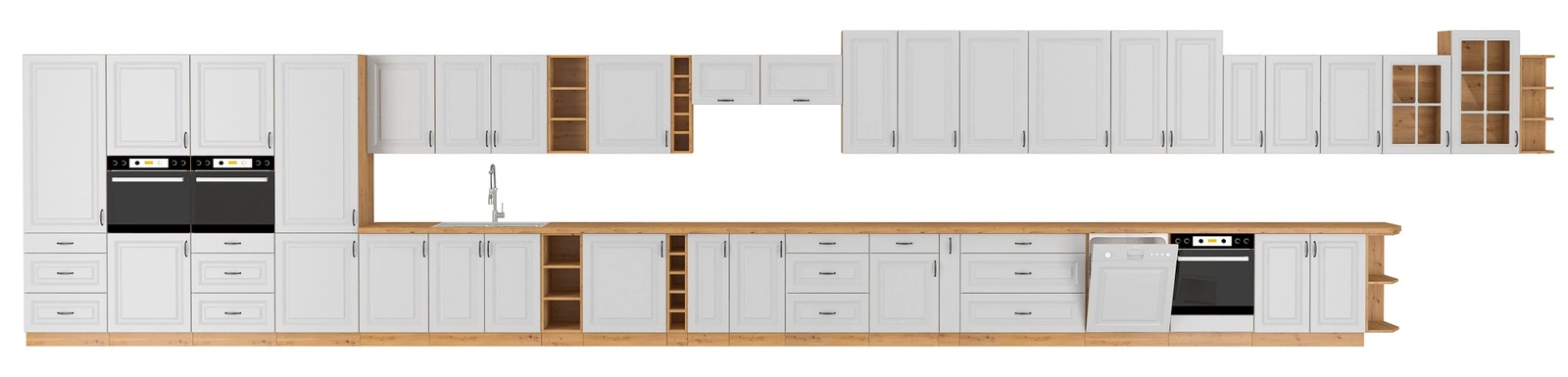 Vnitřek kuchyňské linky je rozdělen na čtyři části. Dvě police lze vytáhnout a vytvořit tak prostor pro vysoké předměty. Dveře jsou univerzální a lze je namontovat na pravou nebo levou stranu. Standardním vybavením kuchyňské skříňky jsou panty se systémem tichého dovírání. Zpomalovače zvyšují komfort a bezpečnost používání nábytku.