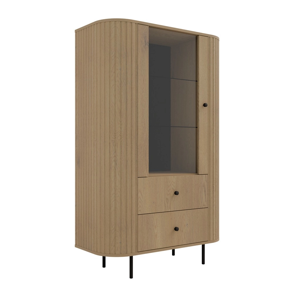 Nástěnná skříňka Ovalio je vyrobena z vysoce kvalitní laminované desky a odolné MDF desky. Materiály použité při výrobě se vyznačují odolností vůči vnějším vlivům, jako jsou otlaky, nárazy a nešťastné škrábance. Jednoduché, metalové nohy a knoflíkové rukojeti dodávají vizuální lehkost při zachování funkčnosti. Standardní výbava zahrnuje závěsy a výsuvy zásuvek se systémem tichého dovírání. Použité systémy zvyšují pohodlí a bezpečnost nábytku. Vnitřek vitríny je vybaven policemi vyrobeno z odolného tvrzeného skla o tloušťce 5 mm.