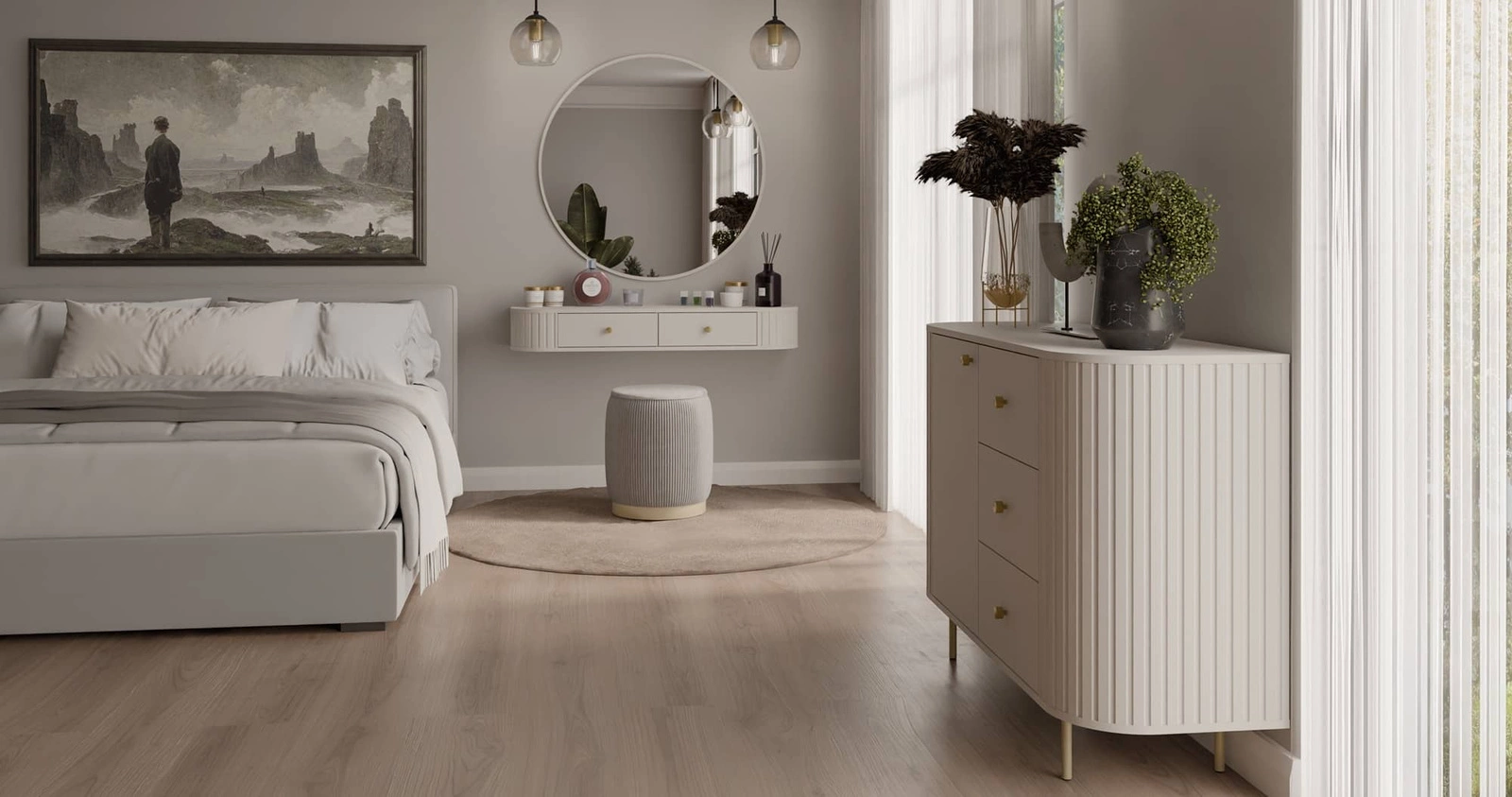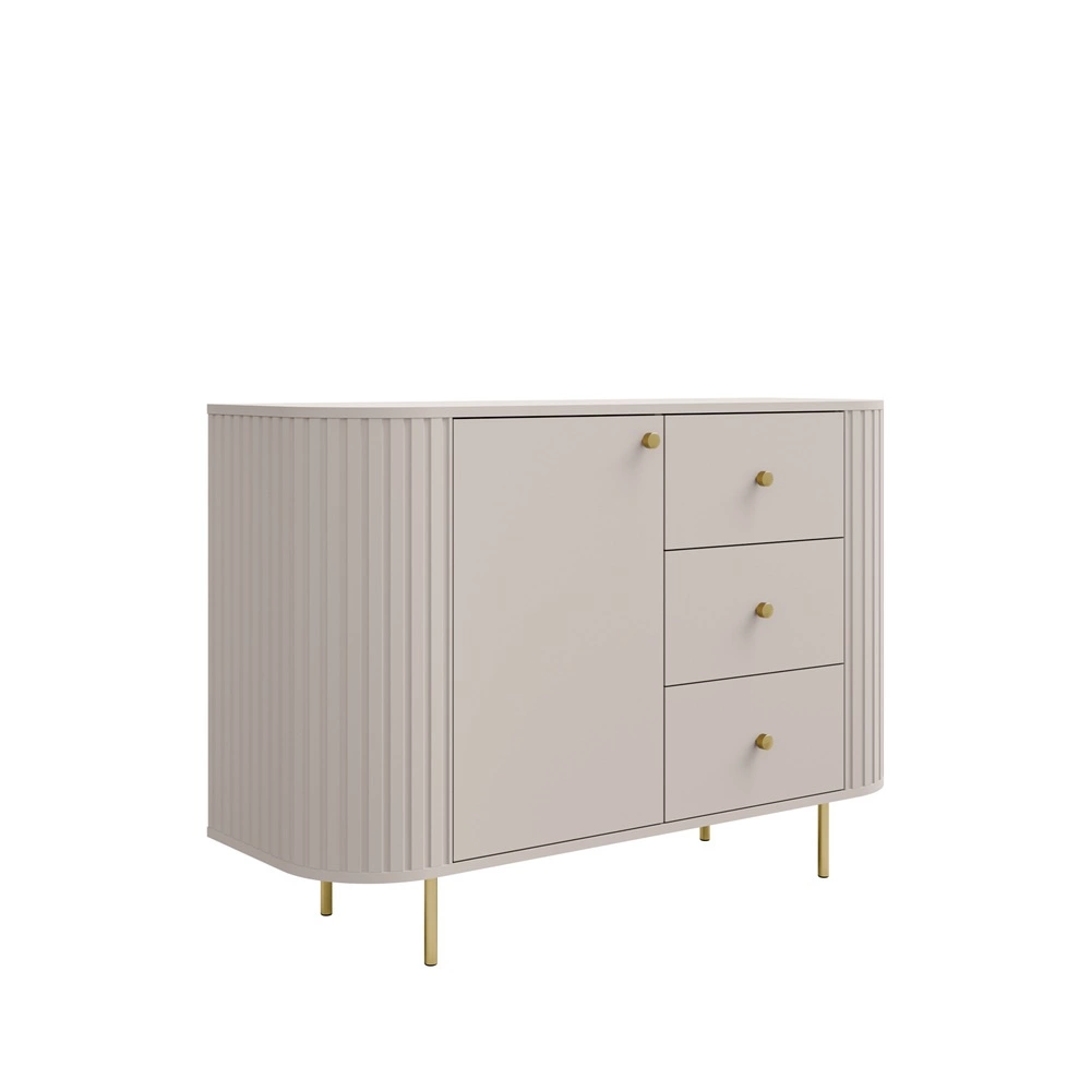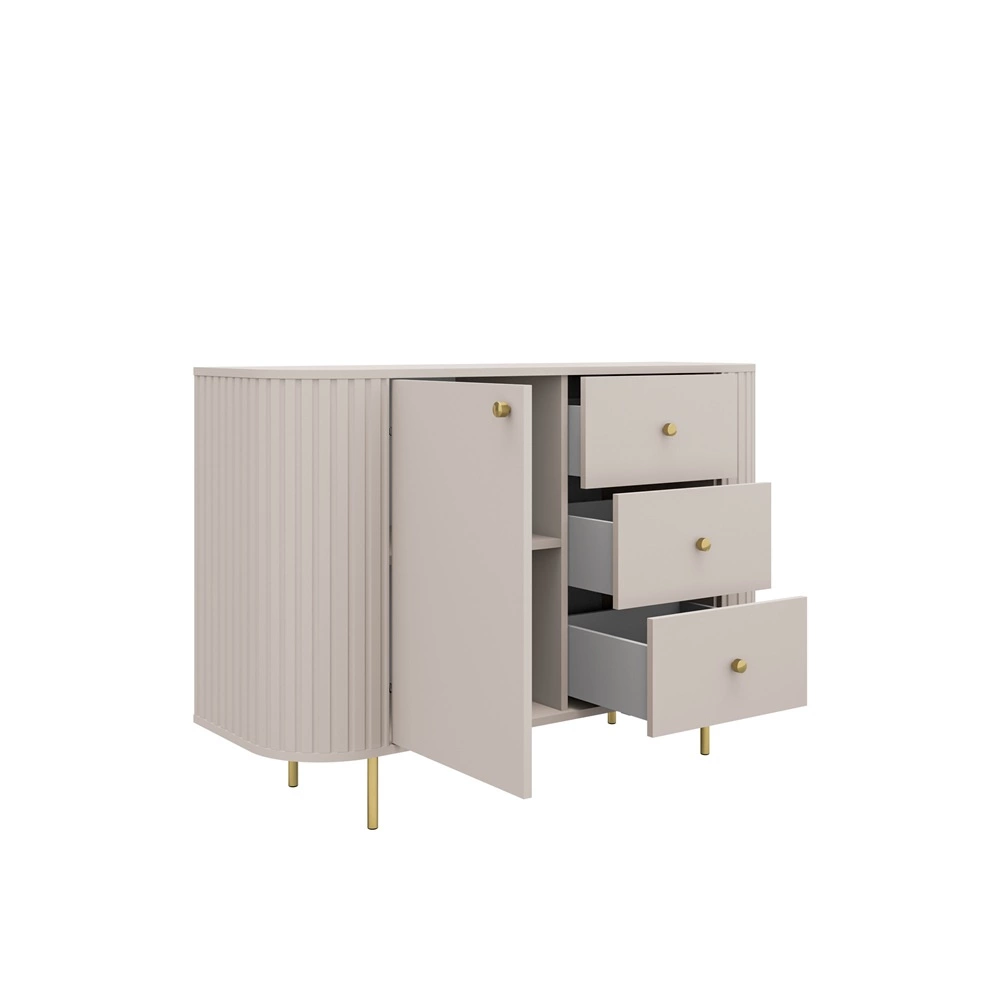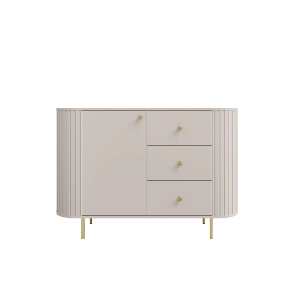 Komoda Ovalio 123 cm v béžové barvě je moderní kus nábytku, který překvapí svým tvarem a estetikou.