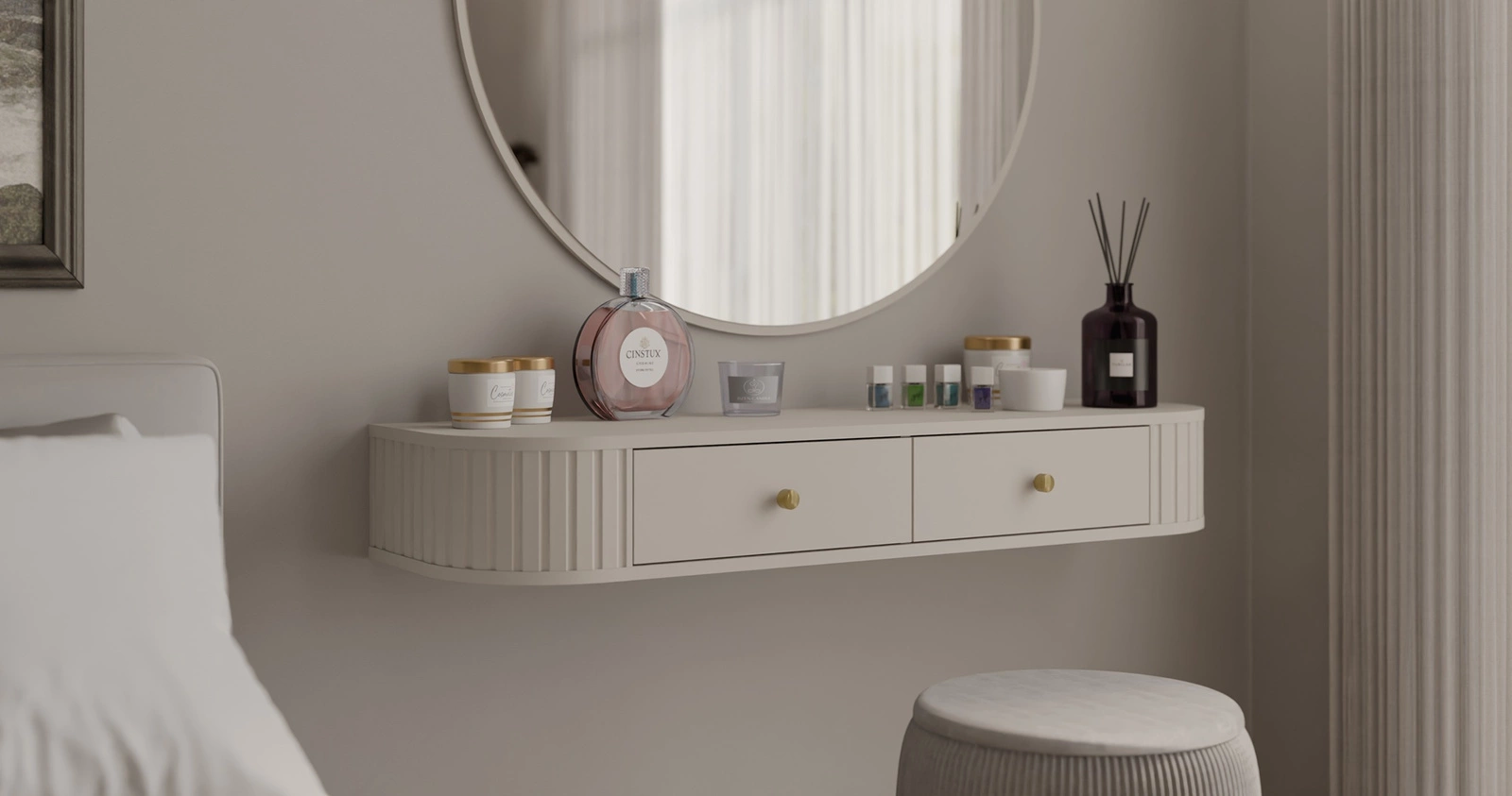Závěsná konzola Ovalio je jedinečný kus nábytku, ve kterém se moderní design snoubí s jemnou elegancí. Zaoblené tvary a měkké linie, které se liší pečlivým frézováním vnášejí do interiéru lehkost, klid a harmonii a vytvářejí nadčasový design. Módní béžová barva v pískovém odstínu je doplněna zlatými kovovými akcenty rozbít světlé barvy toaletního stolku a zároveň nepřehlušit světlé tvary korpusu. Konzola Ovalio je ideální volbou pro ty, kteří si cení estetiky, funkčnosti a nadčasového stylu.