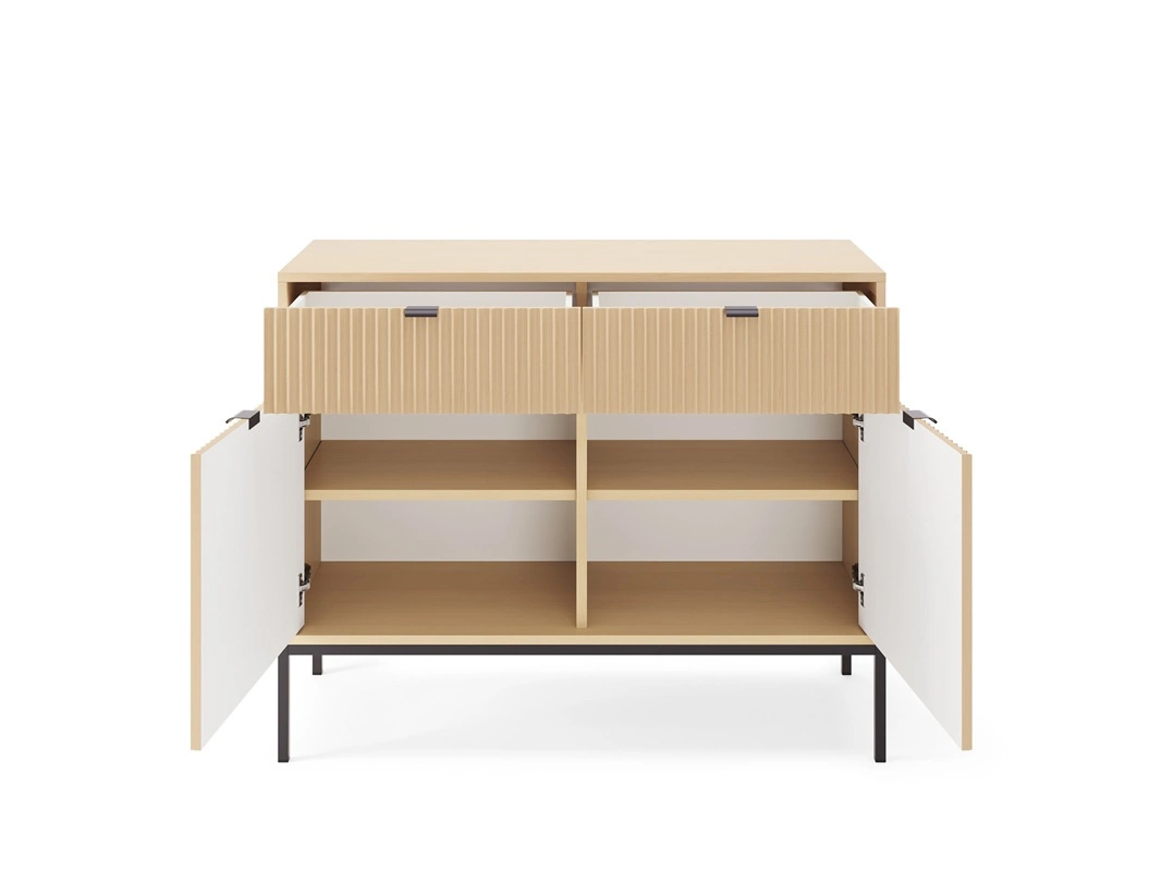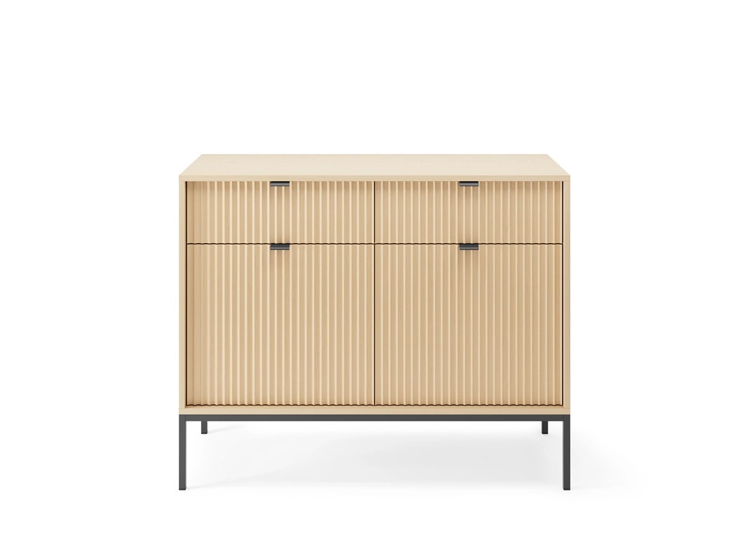 Lovro 104 cm dubová komoda Vicenza Stylová komoda do obývacího pokoje s drážkovanými čely Kovový podstavec v černé barvě