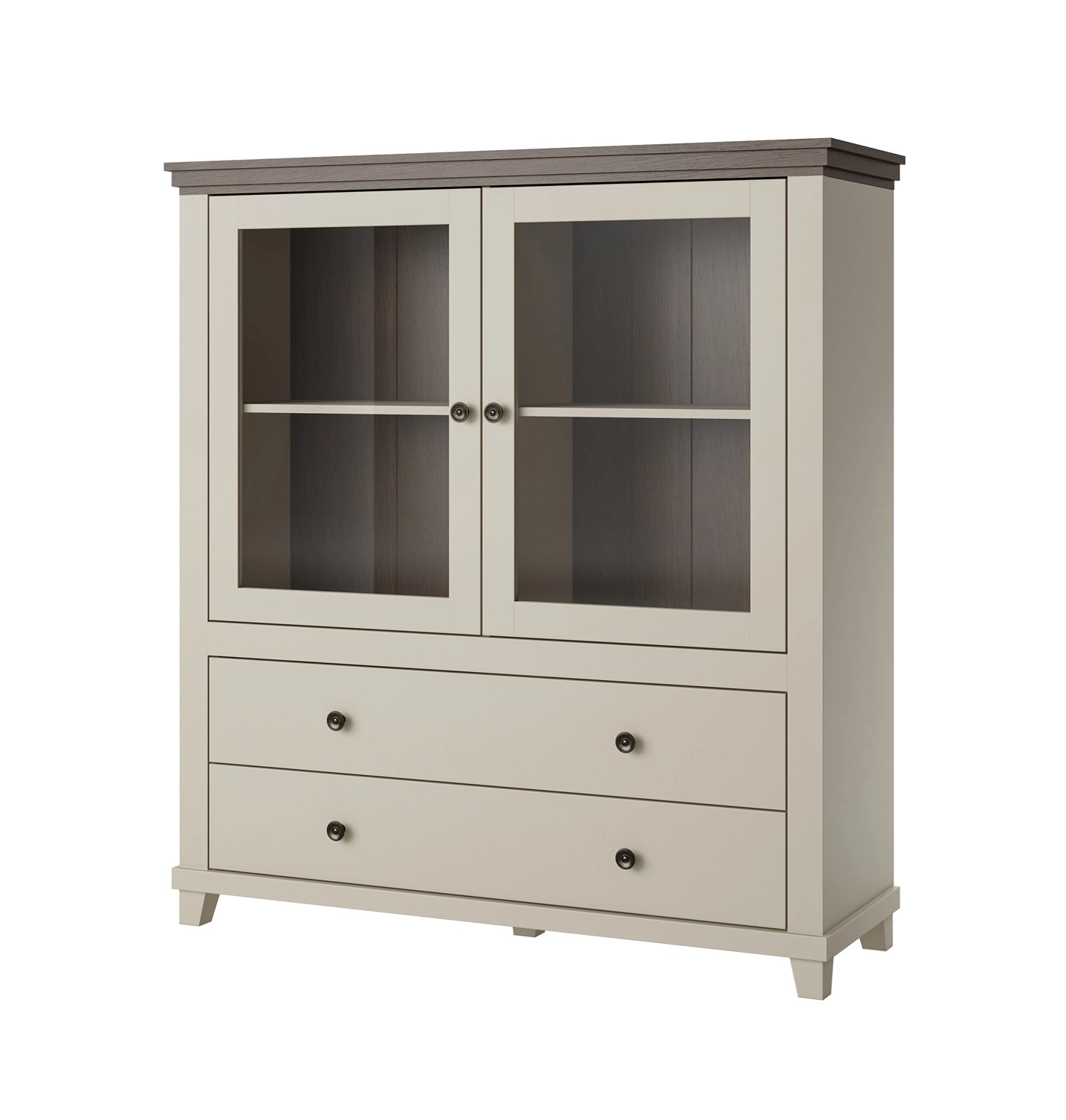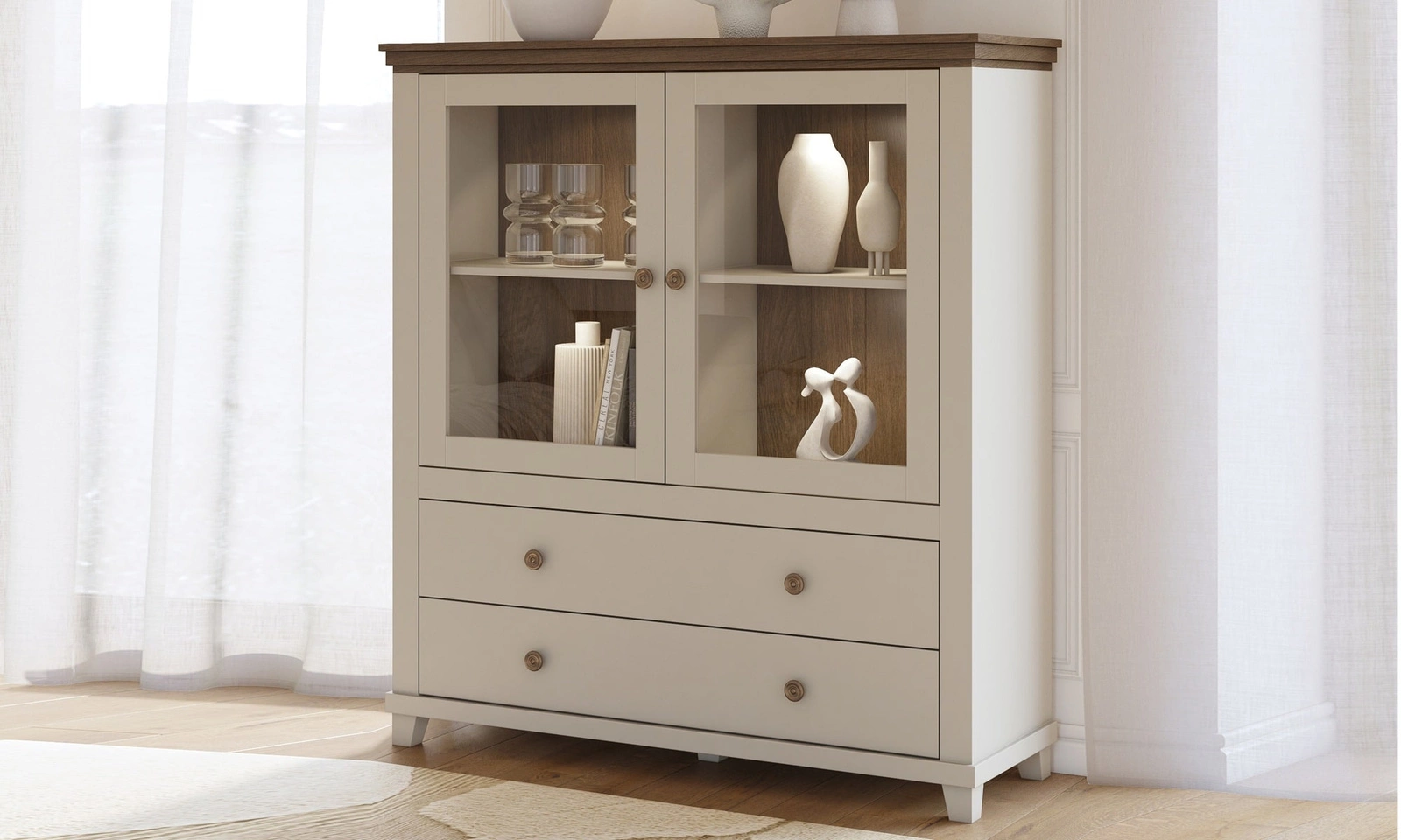 Komoda je vyrobena z vysoce kvalitní laminované desky, který je odolný vůči vnějším vlivům, jako jsou otlaky, nárazy a nešťastné škrábance. Korpus a čela jsou potaženy membránovou fólií v módní béžové barvě, která je vysoce odolná vůči vnějším vlivům. Prosklené čelo komody umožňuje vystavit dekorace do obývacího pokoje. Prostorné zásuvky a zskříně amycd pojme všechny vaše věci a nezbytné příslušenství. Precizní zpracování a pozornost věnovaná detailům komoda Evora bude vypadat krásně po mnoho let, aniž by ztratila svou funkčnost.