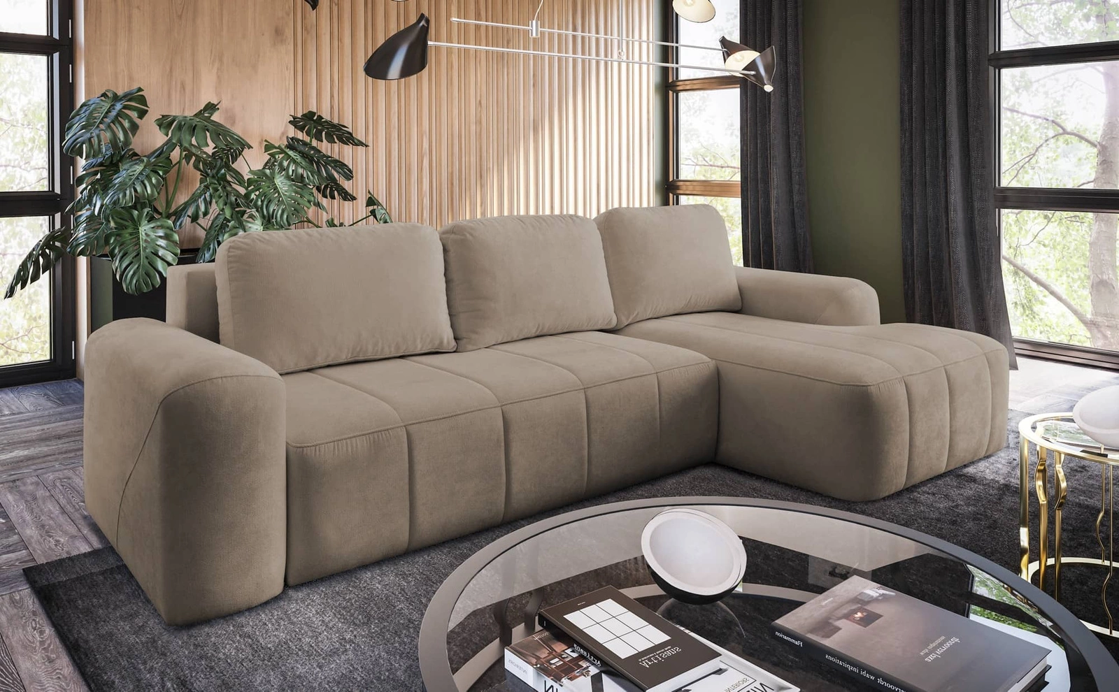 Rohová sedací souprava s funkcí spaní Bovec tmavě béžová pravostranná stylová rohová sedací souprava s ergonomickým tvarem z hydrofobní tkaniny