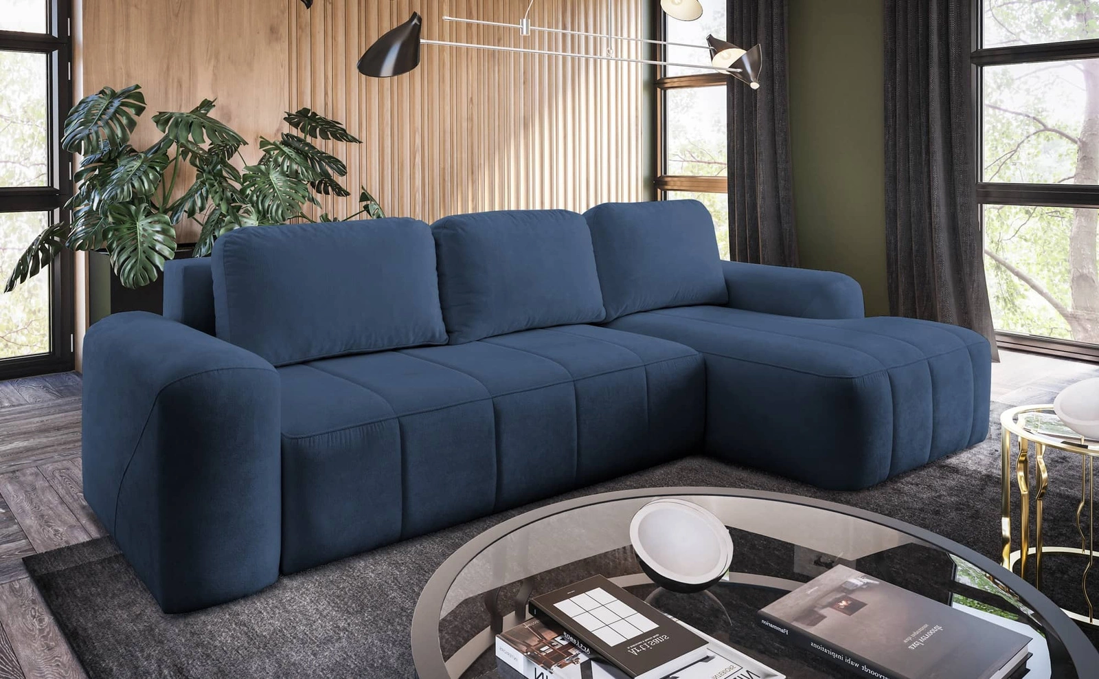 Rohová sedací souprava s funkcí spaní Bovec modrá pravostranná stylová rohová sedací souprava s ergonomickým tvarem z hydrofobní tkaniny