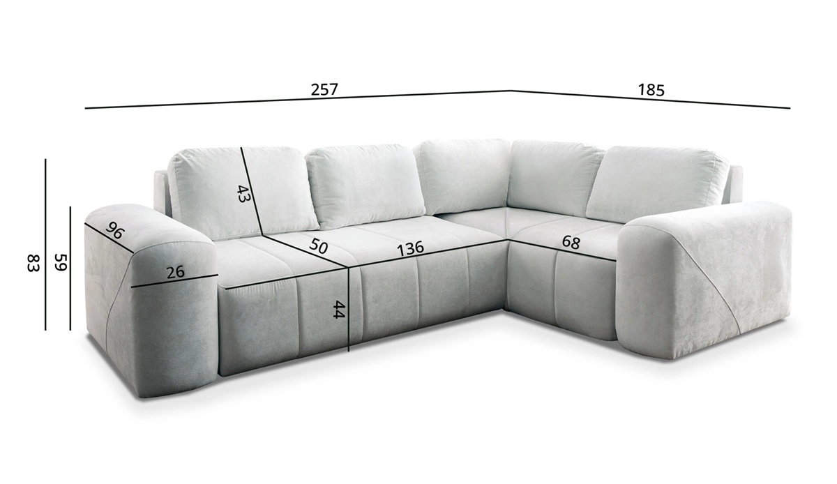Rozměry nábytku umožňují vyplnění prostoru v prostorném obývacím pokoji nebo zasedací místnosti. Šířka rohu 257 cm, výška 83 cm a hloubka 185 cm. Spací plocha rohové jednotky je 125x205 cm. Výška sedadla nábytku je 44 cm a výška opěradla je 43 cm. Vlnité pružiny a polyuretanová pěna T30 je materiál, z něhož je vyrobeno sedadlo rohu. Soft polštáře opěradla zajišťují vysoký komfort při každodenním odpočinkukterý oceníte vy i vaši hosté při posezení na této jedinečné rohové pohovce.