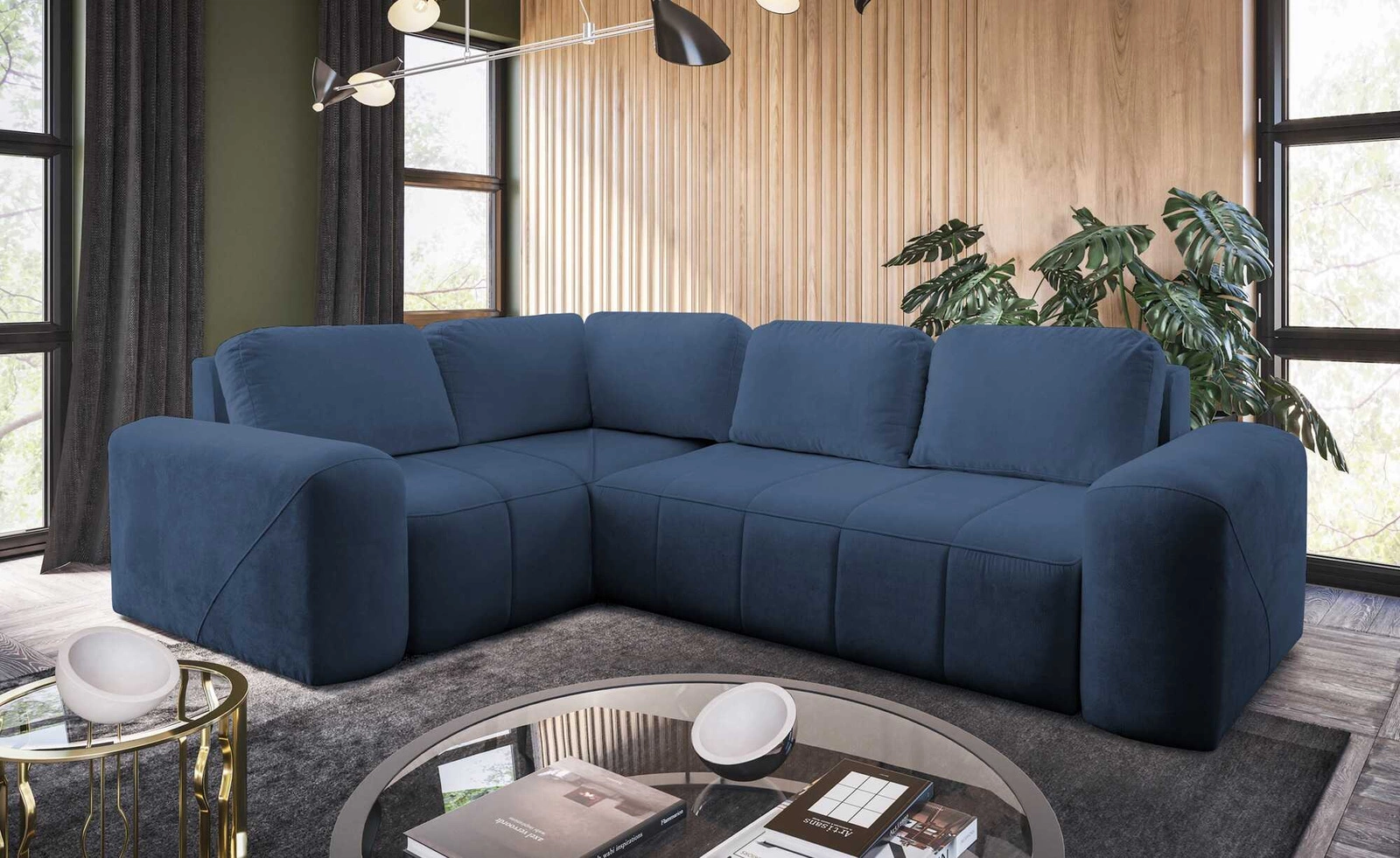 Rohová sedací souprava s funkcí spaní Bovec II modrá levá komfortní rohová sedací souprava se stylovou nádobou na lůžkoviny s charakterem