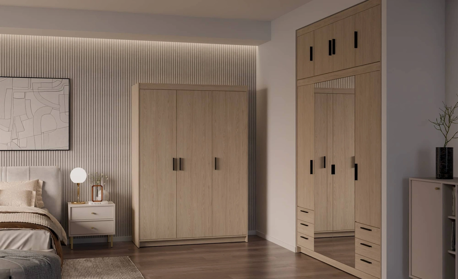 Šatní skříň Rene se vyznačuje jednoduchou formou a geometrickými tvary.
