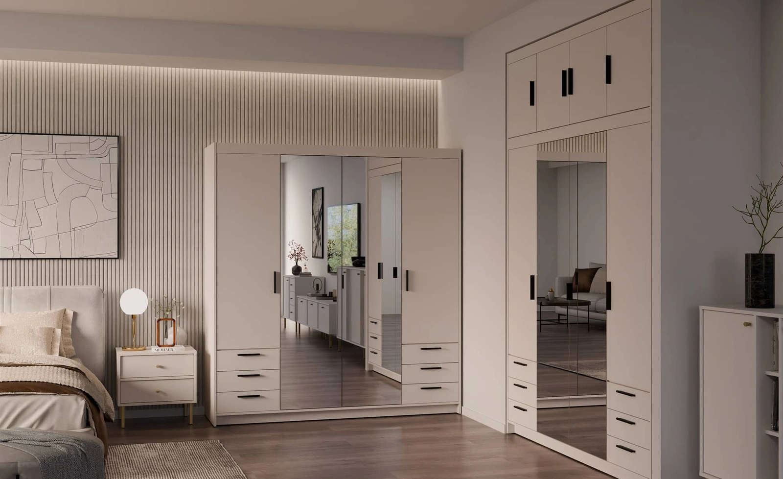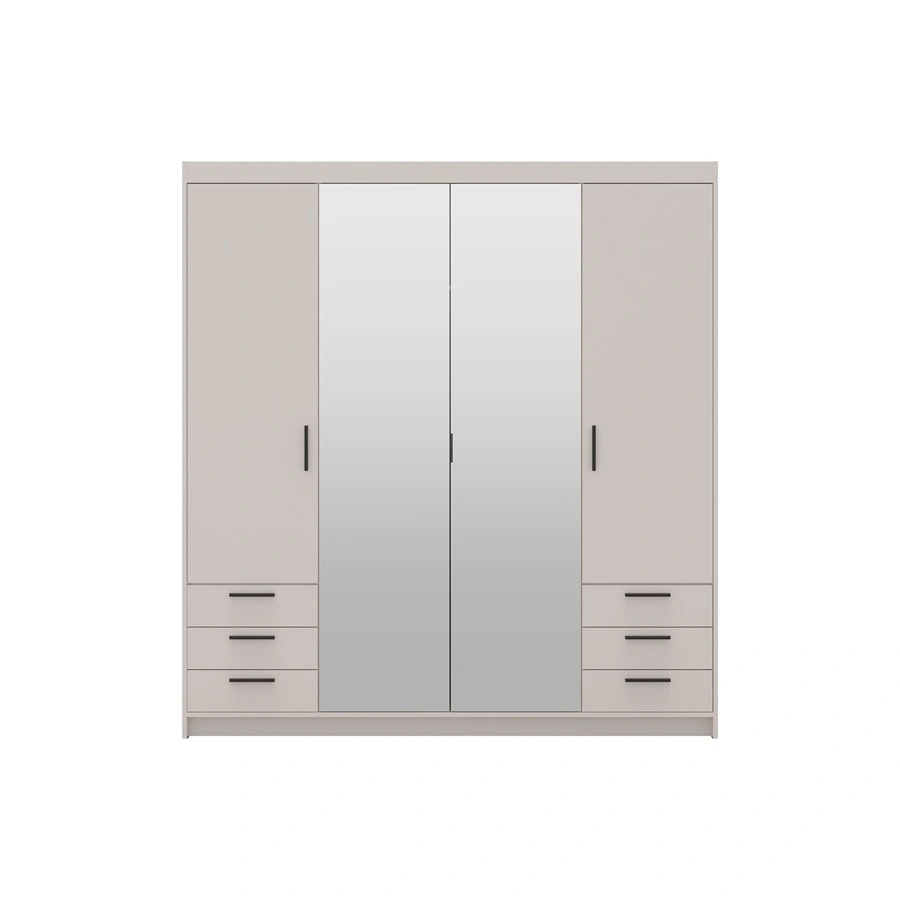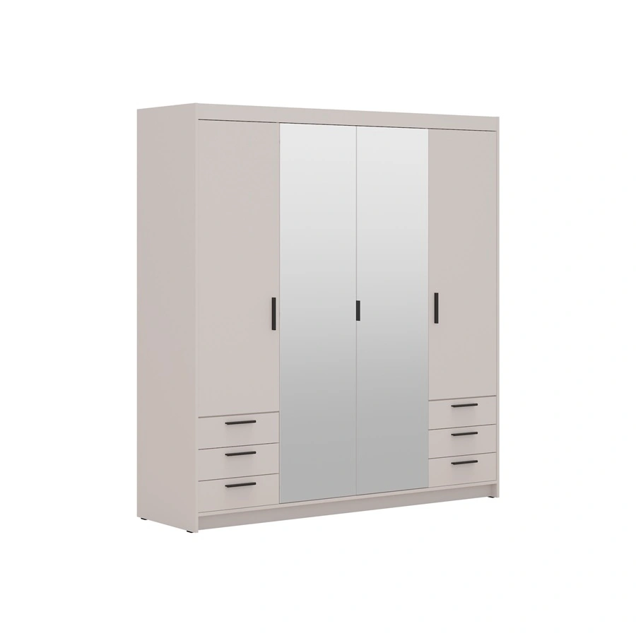 Skříň je vyrobena z 4 dveře a 6 zásuvek. Šatník zaručuje pohodlný i bezproblémové použití a životnost celého nábytku po mnoho let používání. Kombinace pískově béžová s černými rukojeťmi šatní skříň je úspěšná jako šatní skříň do ložnice, do předsíně nebo do dětského pokoje. Zrcadlové skříně Rene jsou skvělou volbou i do dětského pokoje. Skvěle se hodí i jako šatní skříň do předsíně.