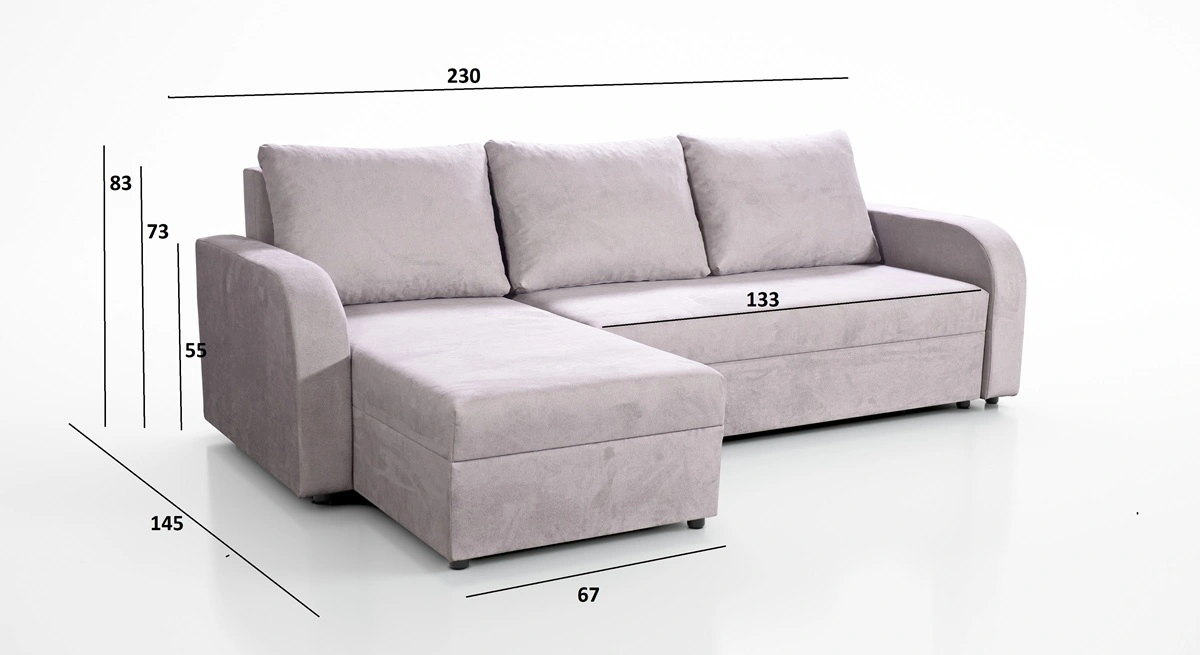 Díky svým rozměrům a široké funkčnosti je rohová pohovka s funkcí spaní ideální jako rohová pohovka do obývacího pokoje nebo jako rozkládací rohová pohovka do pokoje pro hosty. Rohová pohovka s funkcí spaní je také skvělou alternativou k posteli v pokoji pokoj pro mladé. Šířka rohu 230 cm, výška 83 cm a hloubka 145 cm. Spací plocha rohové jednotky je 123x200 cm. Výška sedadla nábytku je 40 cm, a výška opěradla je 43 cm. Polyuretanová pěna T28 je materiál, z něhož je vyrobeno sedadlo rohu. Soft opěrné polštáře zajistí vysokou úroveň pohodlí při každodenním odpočinku, což oceníte vy i vaši hosté, kteří se na tuto jedinečnou rohovou sedačku posadí.