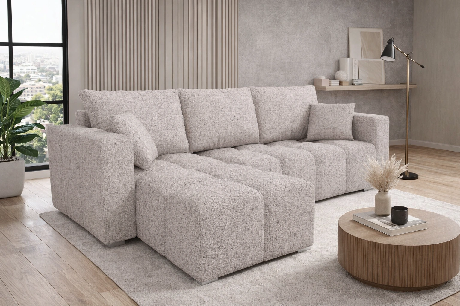 Rohová pohovka Linco s funkcí spaní béžová Univerzální rohová pohovka s moderním designem z odolné tkané látky
